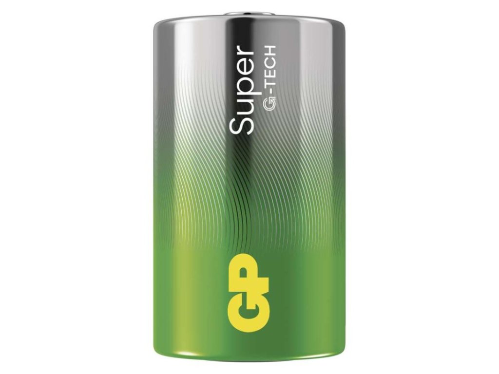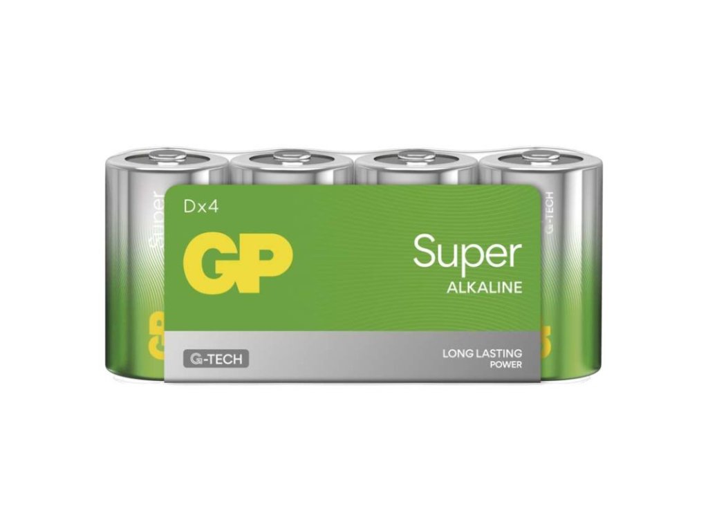 chemické složení: alkalické|hmotnost: 140 g|kapacita: neuvádí se|kategorie/řada: Super Alkaline|max. skladovatelnost: 10 let|možnost nabíjení: ne|napětí: 1,5 V|počet nabíjecích cyklů: nenabíjecí|prodejní obal: 4 ks, fólie|provozní teplota: -18 °C až +50 °C|rozměr: 34,2 × 61,5 mm|typ: LR20 (velké mono, D)|velikost baterie: D|značka: GP
