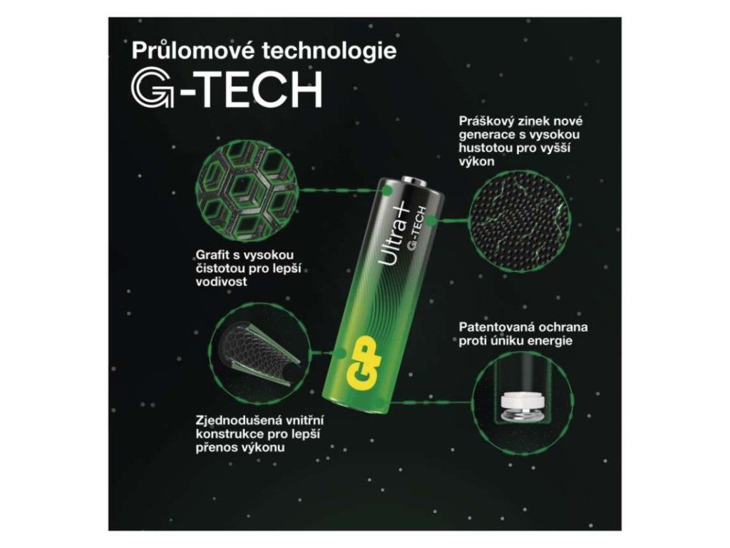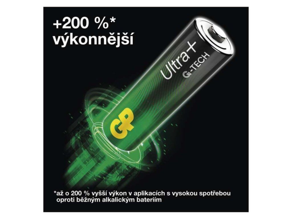 chemické složení: alkalické|hmotnost: 24 g|kapacita: neuvádí se|kategorie/řada: Ultra Plus Alkaline|max. skladovatelnost: 10 let|možnost nabíjení: ne|napětí: 1,5 V|počet nabíjecích cyklů: nenabíjecí|prodejní obal: 2 ks, papírová krabička|provozní teplota: -20 °C až +54 °C|rozměr: 14,5 × 50,5 mm|typ: LR6 (tužka, AA)|velikost baterie: AA|značka: GP