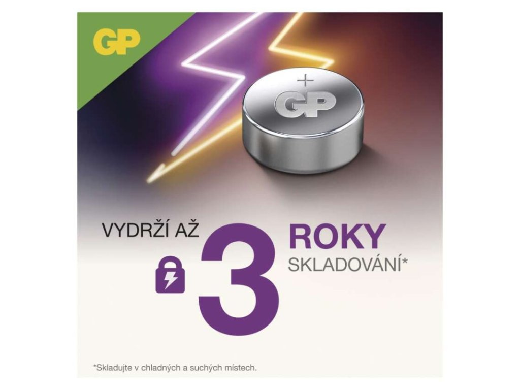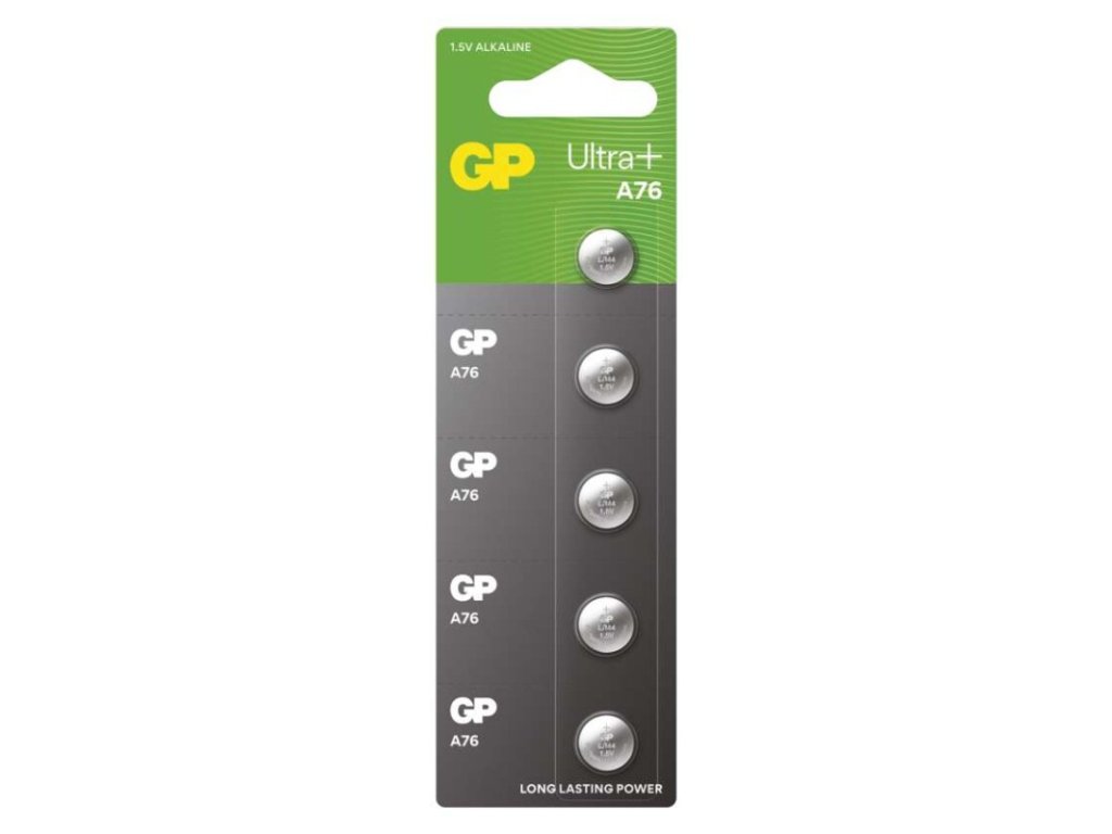 chemické složení: alkalické|hmotnost: 1,7 g|kapacita: 110 mAh (při zátěži 1,6 kOhm)|kategorie/řada: Alkaline cell|max. skladovatelnost: 3 roky|možnost nabíjení: ne|napětí: 1,5 V|počet nabíjecích cyklů: nenabíjecí|prodejní obal: 5 ks, blistr|provozní teplota: 0 °C až +45 °C|rozměr: 11,6 × 5,4 mm|typ: GP A76F (AG13, LR44, LR1154, V13GA, PX76A)|velikost baterie: neuvádí se|značka: GP