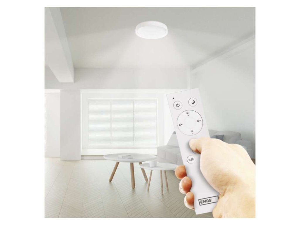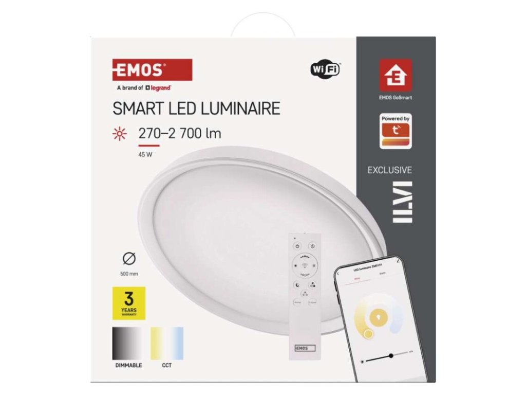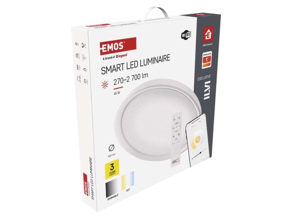 barva světla: teplá bílá–studená bílá|barva těla: bílá|dálkový ovladač: ano (2× AAA, R03)|další funkce: –|do chodby a na schodiště: ano|do dílny a garáže: ne|do kanceláře: ano|do koupelny: ne|do kuchyně: ano|do obýváku, ložnice a dětského pokoje: ano|dosah senzoru: nemá senzor|flicker-free: ano|frekvence: 50/60 Hz|index podání barev (CRI): Ra > 80|jazyky aplikace: EN, CZ, SK, PL, DE, HU, SI, FR, + 60 dalších jazyků|kategorie: EXCLUSIVE|kompatibilita: EMOS GoSmart, TUYA, LIDL, Smartlife, Otevřený systém|krytí: IP20|materiál difuzoru: plast (PMMA)|materiál LGP: neuvádí se|materiál těla: ocelový plech|montážní otvor: neuvádí se|možnost stmívání: ano|náhrada za žárovku: 160 W|napětí: 220–240 V|na zahradu a balkon: ne|notifikace do mobilní aplikace: ano|obsah balení: –|ovládání hlasovými asistenty: ano (Amazon Alexa, Google Assistant)|podporované OS: Android, iOS|pohybový senzor: neuvádí se|přenosová frekvence: 2,4 GHz Wi-Fi|příkon: 45 W|prodejní obal: 1 ks, krabice|protokol: Wi-Fi|proud: 450 mA|řada: GoSmart|rozměr: průměr 500 × 70 mm|světelná účinnost: 60 lm/W|světelný tok: 2 700 lm|teplota chromatičnosti: 2 700–6 500 K|tvar: kruh|typ difuzoru: mléčný|typ svítidla: klasické svítidlo|účiník: > 0,9|UGR<: neuvádí se|úhel vyzařování: 115°|umístění: stropní/nástěnné|výstupní proud ze zdroje: 175 mA|záruční doba: 3 roky|zdroj světla: LED|životnost: 30 000 hodin|způsob montáže: přisazené