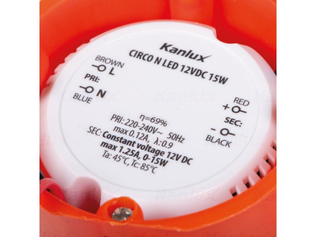 Kanlux CIRCO N je elektronický napájecí zdroj s konstantním napětím a výkonem 10 nebo 15 W. Slouží k napájení elektronických zařízení, lamp a LED pásků uzpůsobených pro provoz s napětím 12 V DC.