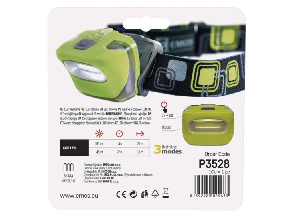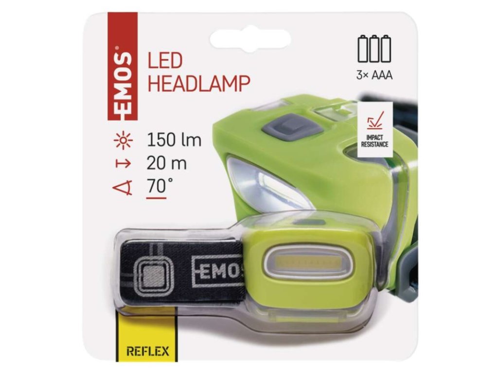barva: zelená|baterie součástí balení: ne|doba nabíjení: neuvádí se|doba svícení: 8–27 h|doba svícení detail: COB LED 100 % – 8 h, COB LED 50 % – 27 h|dosvit: COB LED 100 % – 20 m, COB LED 50 % – 10 m|fokus: ne|hmotnost: 53 g/88 g|LED indikace nabíjení: neuvádí se|LED indikace stavu akumulátoru: neuvádí se|materiál: ABS plast|maximální dosvit: 20 m|maximální světelný tok: 150 lm|nabíjecí: ne|napájení: 3× AAA|nárazuvzdornost: ano|počet režimů svícení: 3|příslušenství: neuvádí se|prodejní obal: 1 ks, papírový blistr|reflexní pásek: ano|režimy svícení: COB LED 100 %, COB LED 50 %, SOS|rozměr: 60 × 40 × 40 mm|speciální funkce: neuvádí se|světelný tok: COB LED 100 % – 150 lm, COB LED 50 % – 45 lm|typ baterie: LR03 (1,5 V)|typ napájecího konektoru: neuvádí se|úhel vyzařování: 70°|voděodolnost: ne|vybavení: neuvádí se|záruční doba: 2 roky|zdroj světla: COB LED|značka: EMOS