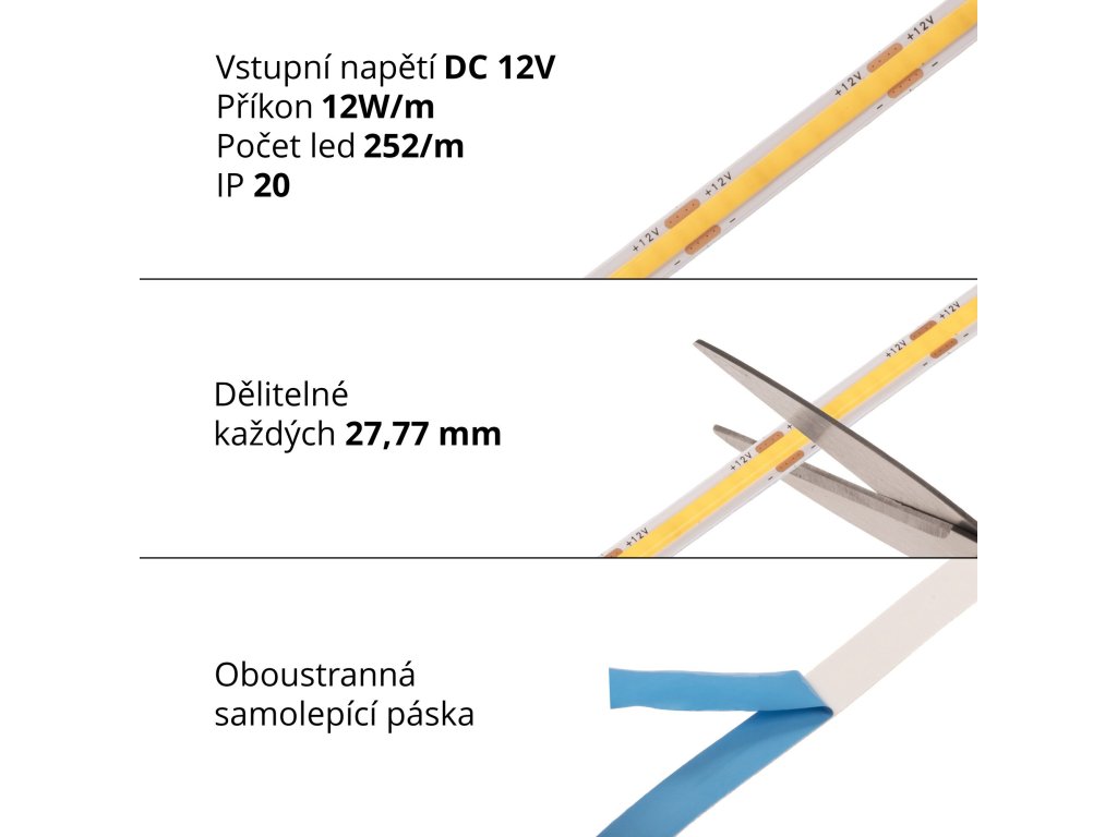 12V, 12W/metr, 252 LED/metr, LED pásek COB IP20, CRI 70
