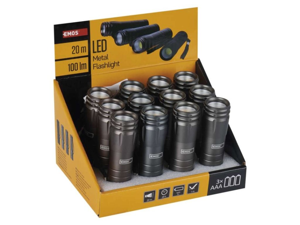 barva: černá, šedá, stříbrná|baterie součástí balení: ano|doba nabíjení: neuvádí se|doba svícení: 28 h|doba svícení detail: COB LED 100 % – 28 h|dosvit: COB LED 100 % – 20 m|fokus: ne|hmotnost: neuvádí se|LED indikace nabíjení: neuvádí se|LED indikace stavu akumulátoru: neuvádí se|materiál: hliník|maximální dosvit: 20 m|maximální světelný tok: 100 lm|nabíjecí: ne|napájení: 3× AAA|nárazuvzdornost: ano|počet režimů svícení: 1|příslušenství: neuvádí se|prodejní obal: 12 ks, display box|režimy svícení: COB LED 100 %|rozměr: 102 × 28 × 28 mm|speciální funkce: neuvádí se|světelný tok: COB LED 100 % – 100 lm|typ baterie: LR03 (1,5 V)|typ napájecího konektoru: neuvádí se|voděodolnost: ano (IP43)|vybavení: poutko|záruční doba: 2 roky|zdroj světla: COB LED|značka: EMOS