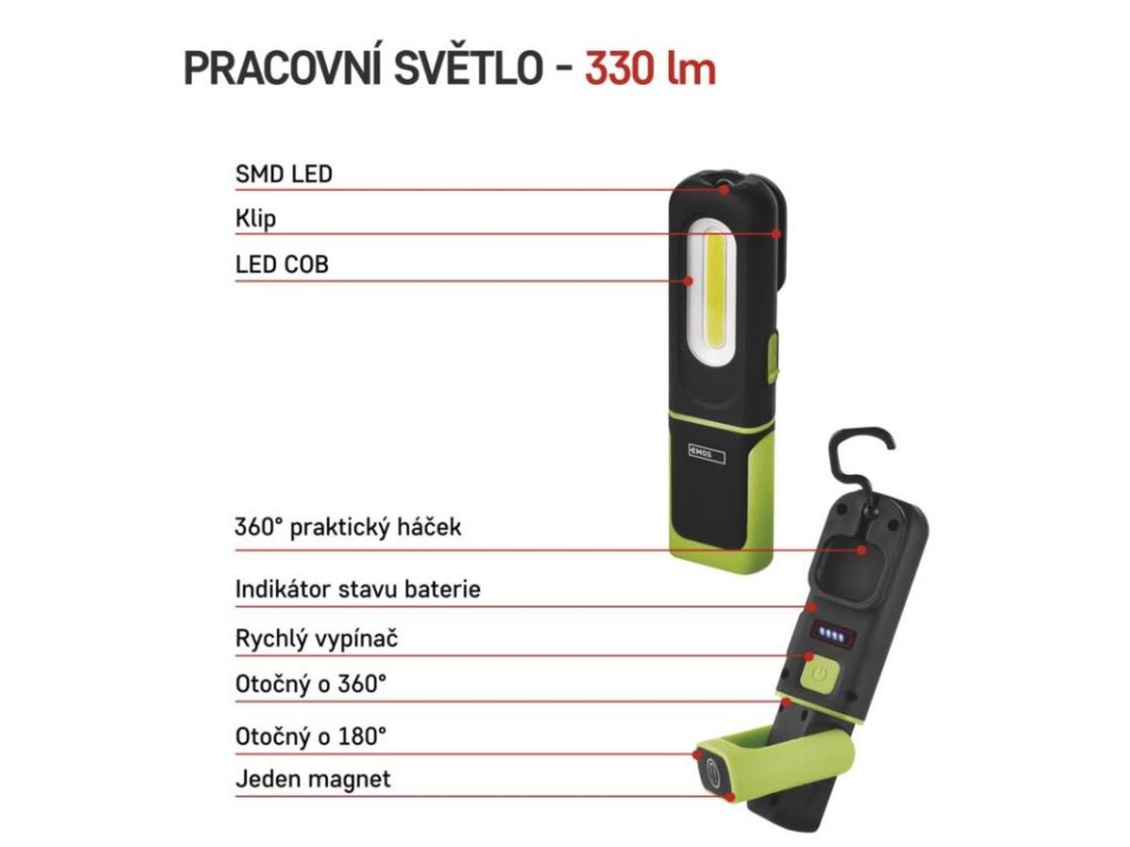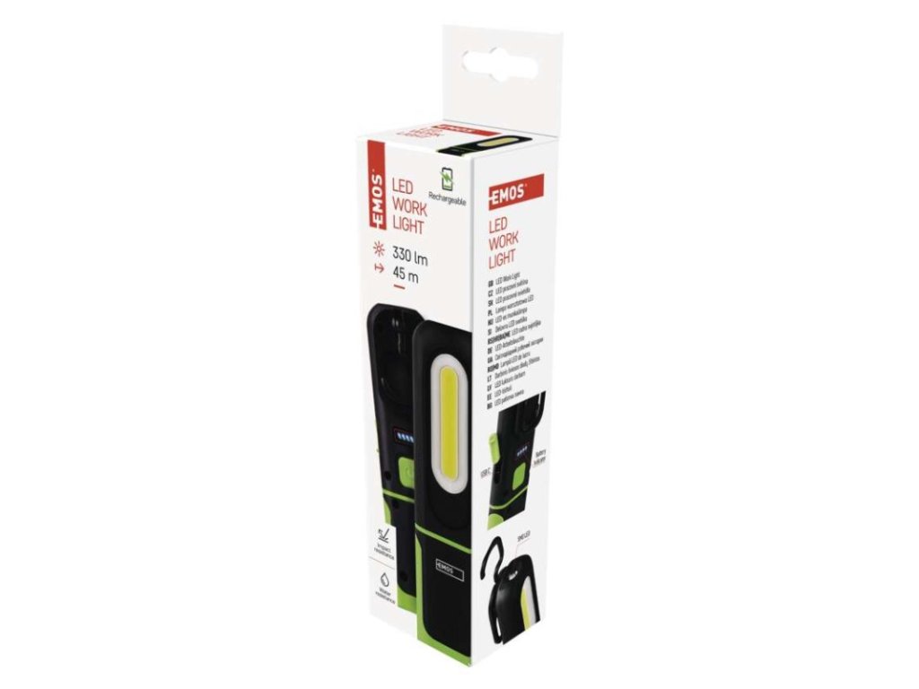 barva: zeleno-černá|baterie součástí balení: ano|doba nabíjení: 2–4 h|doba svícení: 3–7 h|doba svícení detail: COB LED 100 % – 3 h, COB LED 33 % – 5,5 h, SMD LED 100 % – 7 h|dosvit: COB LED 100 % – 25 m, COB LED 33 % – 15 m, SMD LED 100 % – 45 m|fokus: ne|hmotnost: 110 g|LED indikace nabíjení: ano|LED indikace stavu akumulátoru: ano|materiál: ABS plast + guma|maximální dosvit: 45 m|maximální světelný tok: 330 lm|nabíjecí: ano|napájení: Li-Ion|nárazuvzdornost: ano|počet režimů svícení: 3|příslušenství: USB kabel|prodejní obal: 1 ks, krabice|režimy svícení: COB LED 100 %, COB LED 33 %, SMD LED 100 %|rozměr: 41 × 29 × 154 mm|speciální funkce: funkce rychlého vypnutí, funkce ochrany baterie|světelný tok: COB LED 100 % – 330 lm, COB LED 33 % – 100 lm, SMD LED 100 % – 60 lm|typ baterie: 1 200 mAh/3,7 V|typ napájecího konektoru: USB C|voděodolnost: ano (IP43)|vybavení: otoč. nakl. rukojeť, 1× klip, magnet, hák|záruční doba: 2 roky|zdroj světla: COB LED + SMD LED|značka: EMOS