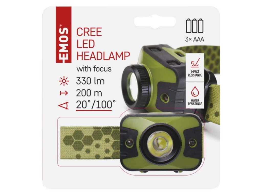 barva: zeleno-černá|baterie součástí balení: ne|doba nabíjení: neuvádí se|doba svícení: 50–87 h|doba svícení detail: CREE LED 100 % – 50 h, CREE LED 50 % – 87 h|dosvit: CREE LED 100 % – 200 m, CREE LED 50 % – 140 m|fokus: ano|hmotnost: 70 g/105 g|LED indikace nabíjení: neuvádí se|LED indikace stavu akumulátoru: neuvádí se|materiál: plast + pogumováno|maximální dosvit: 200 m|maximální světelný tok: 330 lm|nabíjecí: ne|napájení: 3× AAA|nárazuvzdornost: ano|počet režimů svícení: 5|příslušenství: neuvádí se|prodejní obal: 1 ks, papírový blistr|reflexní pásek: ne|režimy svícení: CREE LED 100 %, CREE LED 50 %, SOS, červené LED svícení, červené LED blikání|rozměr: 60 × 48 × 43 mm|speciální funkce: rychlé vypnutí, ochrana bat.|světelný tok: CREE LED 100 % – 330 lm, CREE LED 50 % – 170 lm|typ baterie: LR03 (1,5 V)|typ napájecího konektoru: neuvádí se|úhel vyzařování: 20°/100°|voděodolnost: ano (IP43)|vybavení: neuvádí se|záruční doba: 2 roky|zdroj světla: CREE LED + 2× červená LED|značka: EMOS