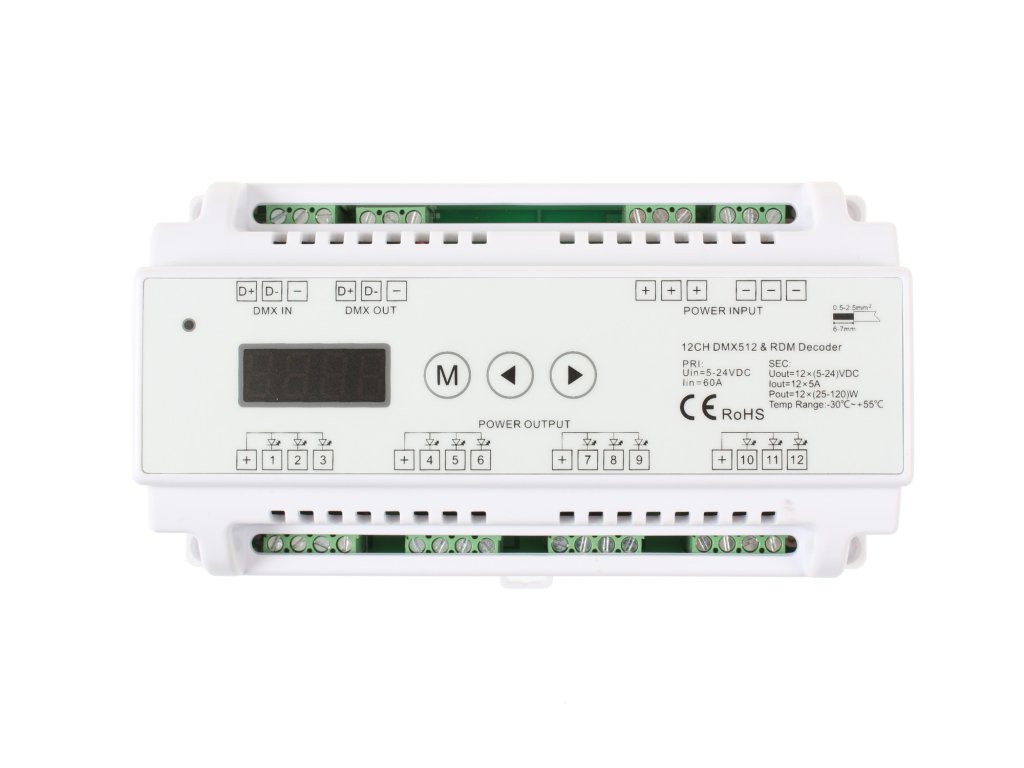 DMX512 12CH je 12ti-kanálový převodník určený pro ovládání LED systémů se společnou anodou pomocí DMX konzole, mezi které patří například jednobarevné a RGB pásky.