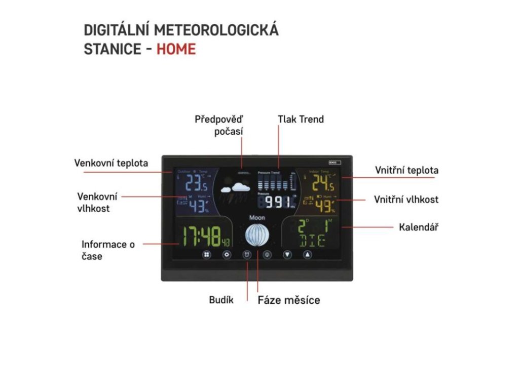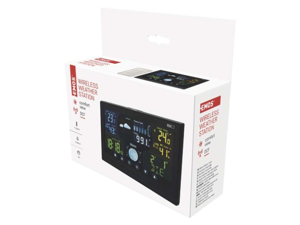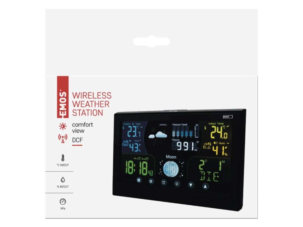12/24 formát času: ano|anemometr: ne|barevný displej (black mask) podsvícený: ano|barometr: ano|budík: ano, 2×|časová pásma: ano|datum: ano|dosah čidla: až 100 m|drátová sonda k čidlu: ne|elektronické plošné podsvícení: ano|fáze měsíce: ano|hodiny: řízené DCF signálem|kalendář: ano|korekce nadmořské výšky: ano|LED podsvícení displeje: ano|min. a max. teplota: ano|možné další čidlo: až 3 čidla (E06018)|možnost nastavení jednotky teploty: °C/°F|možnost pověšení na zeď: ano|napájení čidla: 2× 1,5 V AAA (nejsou součástí balení)|napájení stanice: 3× 1,5 V AAA (nejsou součástí balení)|opakované buzení: ano|předpověď počasí: ano|přenosová frekvence: 433 MHz|prodejní obal: 1 ks, krabička|produkt: meteostanice|projekce: ne|provedení: bezdrátové|rozměr čidla: 15 × 62 × 100 mm|rozměr hlavní jednotky: 17 × 192 × 127 mm|síťový adaptér: ano, 5 V DC/300 mA (součástí balení)|srážkoměr: ne|teplotní výstraha: ano|trend teploty: ano|trend tlaku: ano|trvalé podsvícení: ano|velikost displeje: 168 × 93 mm|venkovní teplota: -50 °C až +70 °C, rozlišení 0,1 °C|venkovní vlhkost: 1 % až 99 % RV, rozlišení 1 %|vnitřní teplota: -10 °C až +50 °C, rozlišení 0,1 °C|vnitřní vlhkost: 1 % až 99 % RV, rozlišení 1 %