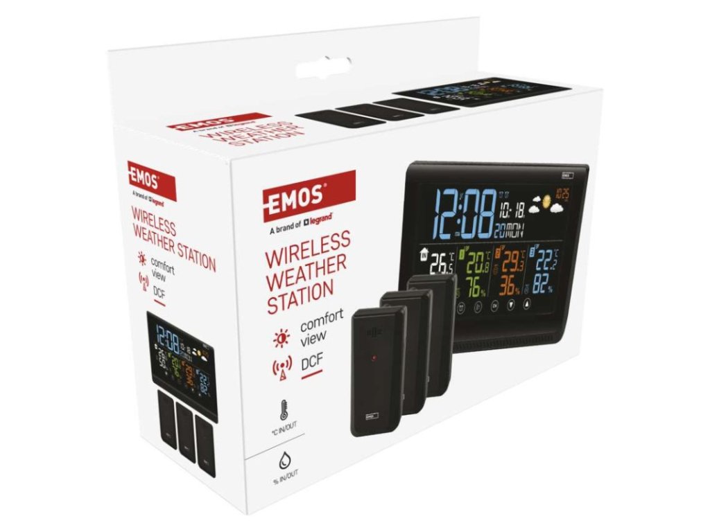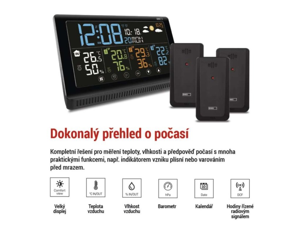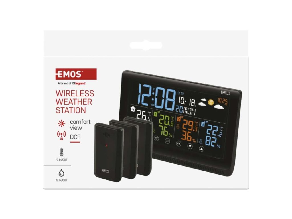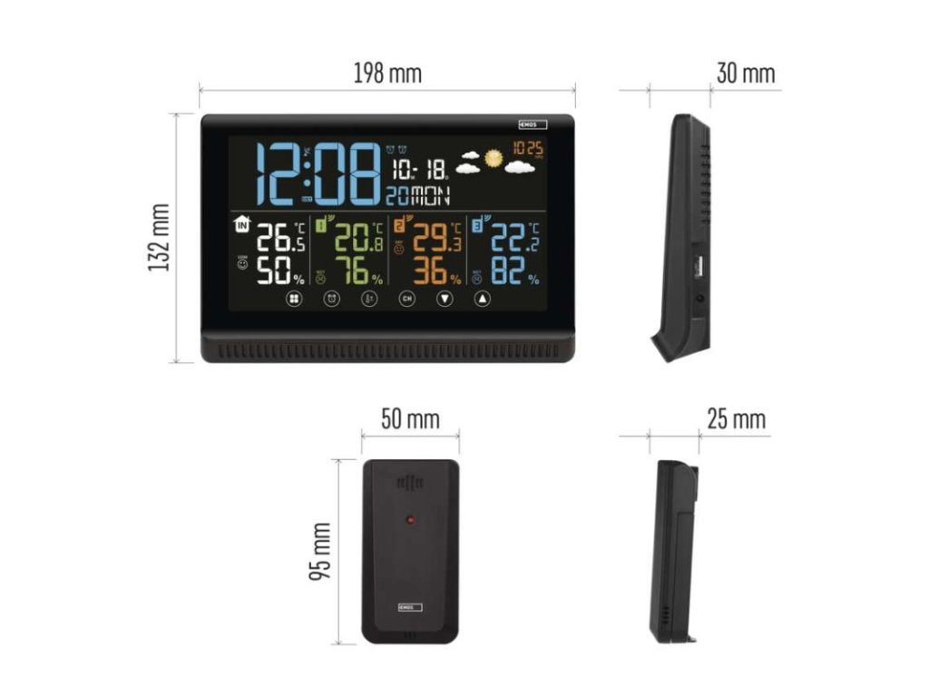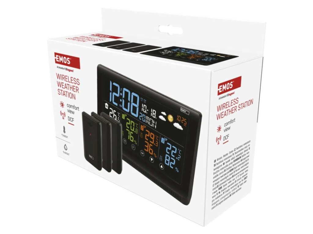12/24 formát času: ano|anemometr: ne|barevný displej (black mask) podsvícený: ano|barometr: ano|budík: ano, 2×|časová pásma: ano|další funkce: USB–A napájecí výstup|datum: ano|dosah čidla: až 80 m|drátová sonda k čidlu: ne|elektronické plošné podsvícení: ano|fáze měsíce: ne|hodiny: řízené DCF signálem|kalendář: ano|kompatibilita: -|korekce nadmořské výšky: ne|LED podsvícení displeje: ano|min. a max. teplota: ano|možné další čidlo: až 3 čidla (E00387, E05018)|možnost nastavení jednotky teploty: °C/°F|možnost pověšení na zeď: ano|napájení čidla: 2× 1,5 V AAA (nejsou součástí balení)|napájení stanice: 3× 1,5 V AAA (nejsou součástí balení)|notifikace do mobilní aplikace: -|opakované buzení: ano|ovládání hlasovými asistenty: -|podporované OS: -|předpověď počasí: ano|přenosová frekvence: 433 MHz|prodejní obal: 1 ks, krabička|produkt: meteostanice|projekce: ne|protokol: -|provedení: bezdrátové|rozměr čidla: 50 × 25 × 95 mm|rozměr hlavní jednotky: 198 × 30 × 132 mm|síťový adaptér: ano, 5 V DC/1 000 mA (součástí balení)|srážkoměr: ne|teplotní výstraha: ne|trend teploty: ne|trend tlaku: ano|trvalé podsvícení: ano|velikost displeje: 169 × 93 mm|venkovní teplota: -40 °C až +70 °C, rozlišení 0,1 °C|venkovní vlhkost: 20 % až 95 % RV, rozlišení 1 %|vnitřní teplota: -10 °C až +50 °C, rozlišení 0,1 °C|vnitřní vlhkost: 20 % až 95 % RV, rozlišení 1 %