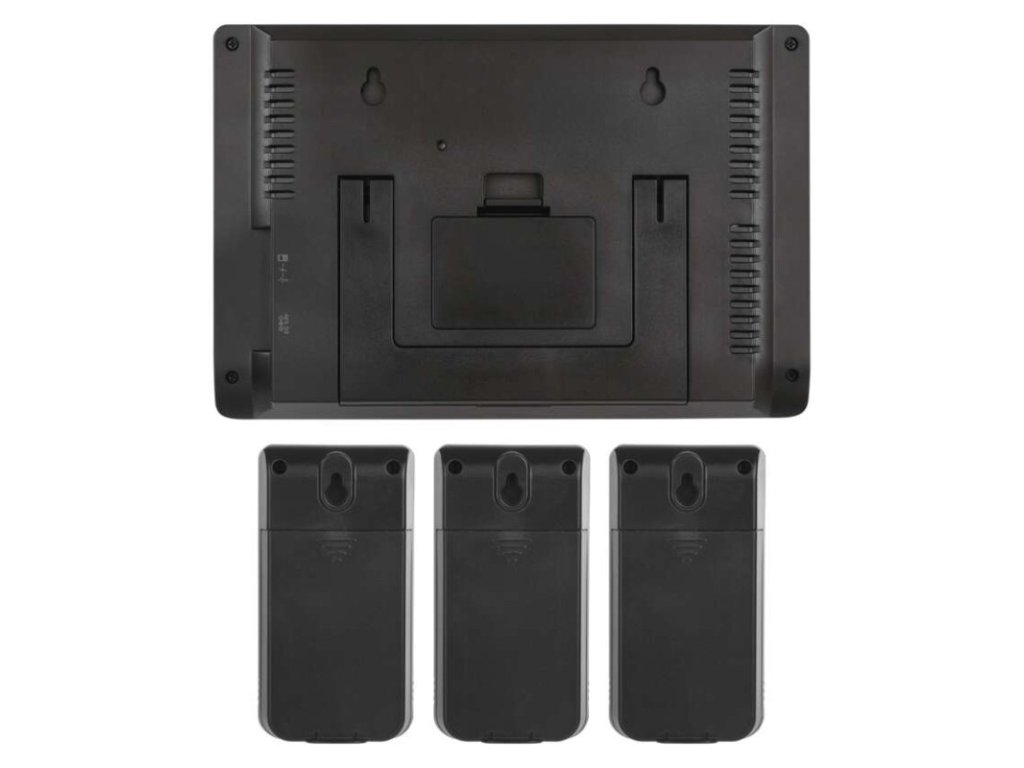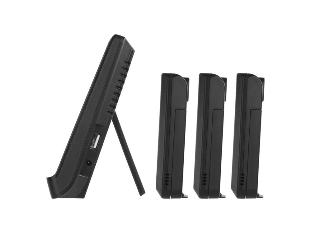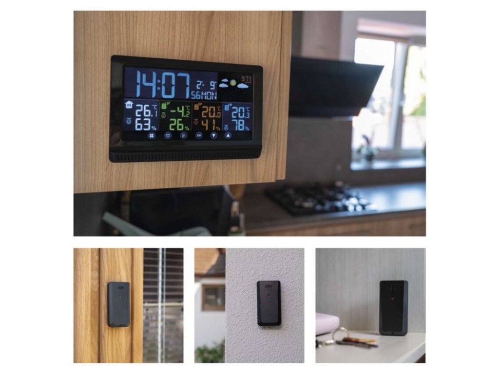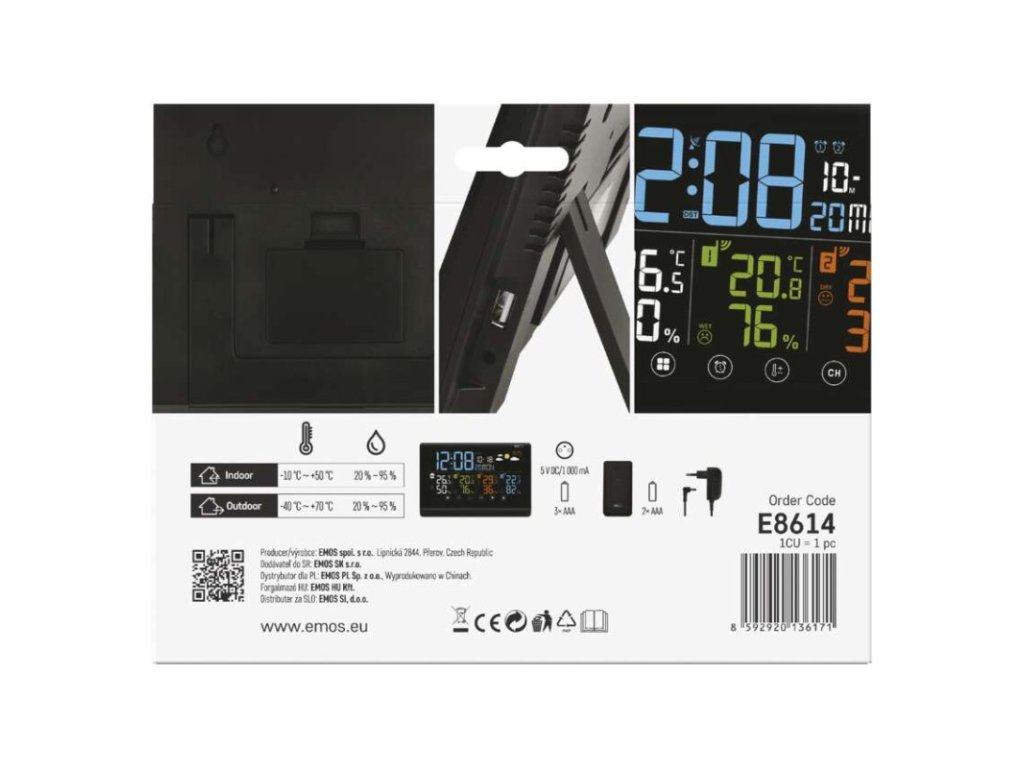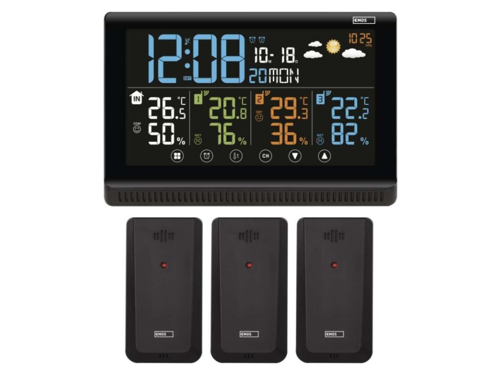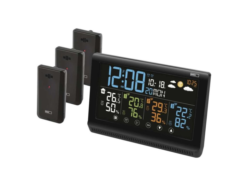 12/24 formát času: ano|anemometr: ne|barevný displej (black mask) podsvícený: ano|barometr: ano|budík: ano, 2×|časová pásma: ano|další funkce: USB–A napájecí výstup|datum: ano|dosah čidla: až 80 m|drátová sonda k čidlu: ne|elektronické plošné podsvícení: ano|fáze měsíce: ne|hodiny: řízené DCF signálem|kalendář: ano|kompatibilita: -|korekce nadmořské výšky: ne|LED podsvícení displeje: ano|min. a max. teplota: ano|možné další čidlo: až 3 čidla (E00387, E05018)|možnost nastavení jednotky teploty: °C/°F|možnost pověšení na zeď: ano|napájení čidla: 2× 1,5 V AAA (nejsou součástí balení)|napájení stanice: 3× 1,5 V AAA (nejsou součástí balení)|notifikace do mobilní aplikace: -|opakované buzení: ano|ovládání hlasovými asistenty: -|podporované OS: -|předpověď počasí: ano|přenosová frekvence: 433 MHz|prodejní obal: 1 ks, krabička|produkt: meteostanice|projekce: ne|protokol: -|provedení: bezdrátové|rozměr čidla: 50 × 25 × 95 mm|rozměr hlavní jednotky: 198 × 30 × 132 mm|síťový adaptér: ano, 5 V DC/1 000 mA (součástí balení)|srážkoměr: ne|teplotní výstraha: ne|trend teploty: ne|trend tlaku: ano|trvalé podsvícení: ano|velikost displeje: 169 × 93 mm|venkovní teplota: -40 °C až +70 °C, rozlišení 0,1 °C|venkovní vlhkost: 20 % až 95 % RV, rozlišení 1 %|vnitřní teplota: -10 °C až +50 °C, rozlišení 0,1 °C|vnitřní vlhkost: 20 % až 95 % RV, rozlišení 1 %
