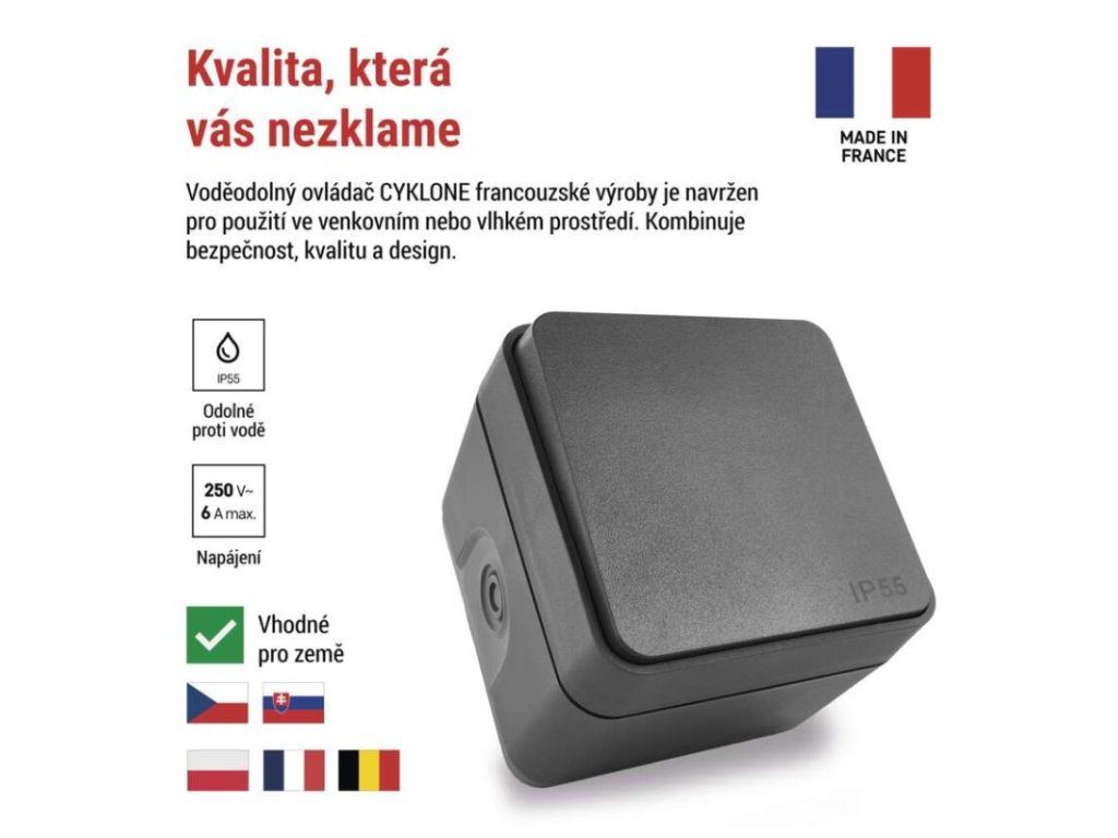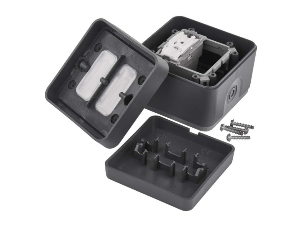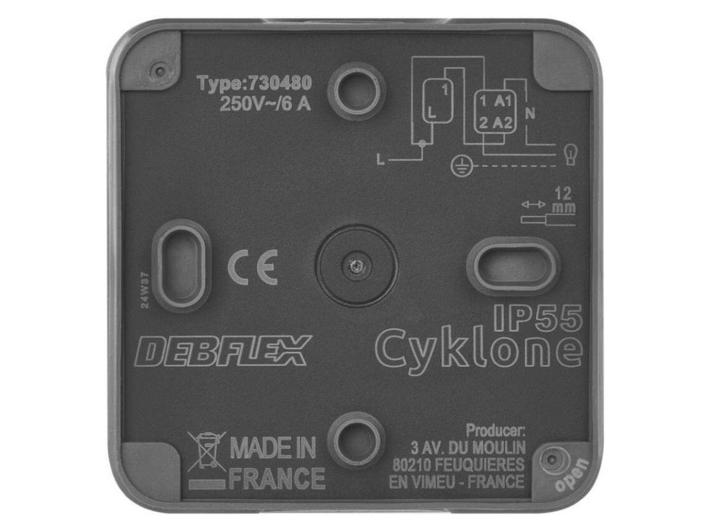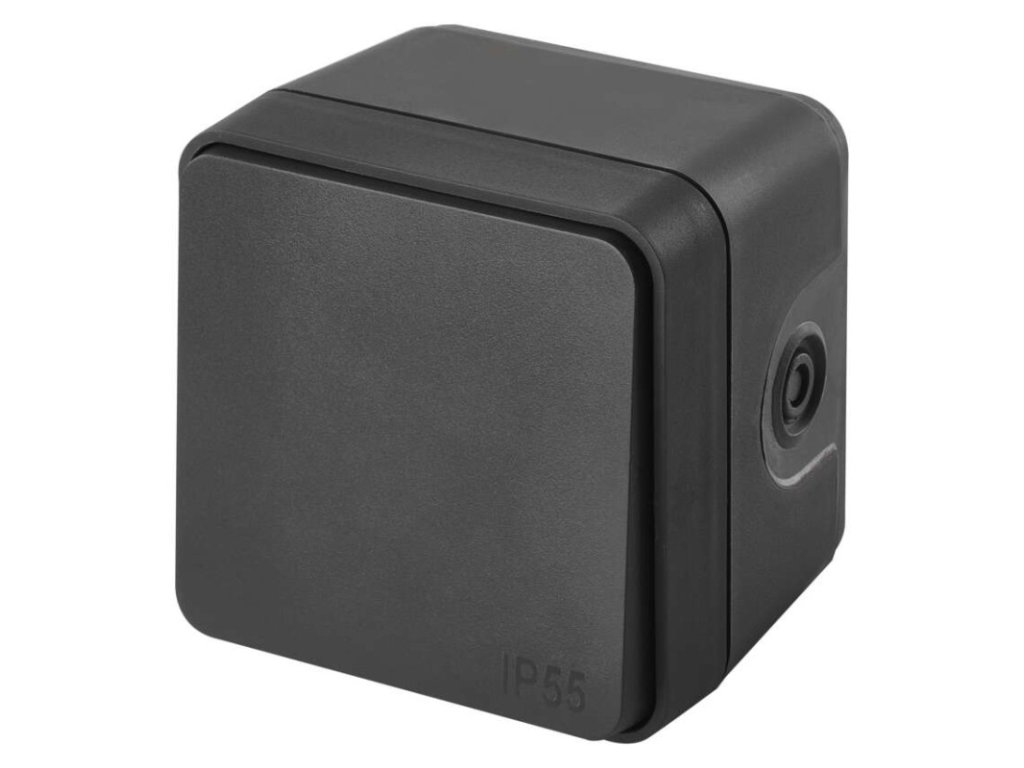 barva: šedá|design: Cyklone|krytí: IP55|napětí: 250 V~|podsvětlení: ne|prodejní obal: 1 ks|produkt: ovladač zapínací (1/0)|proud: 6 A|provedení: 1 tlač. voděodolný|typ připojení: automatická svorka|značka: DEBFLEX|způsob montáže: na stěnu