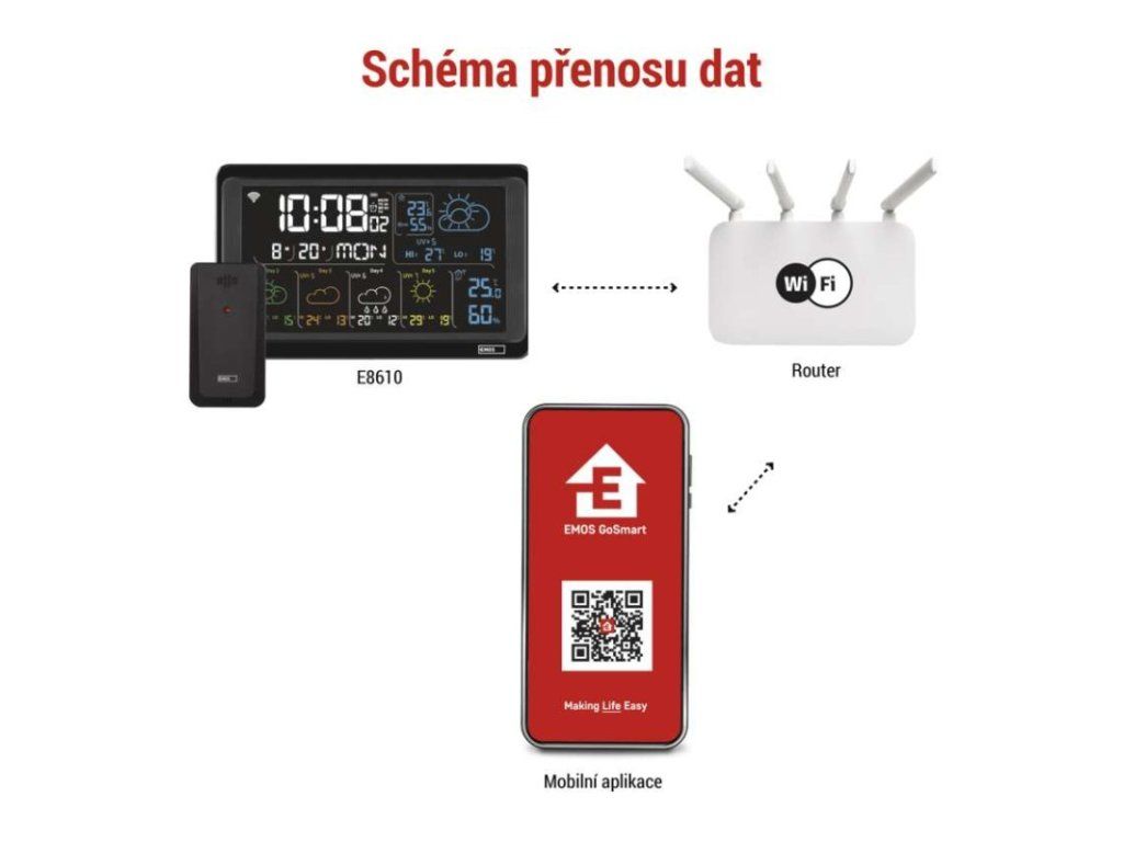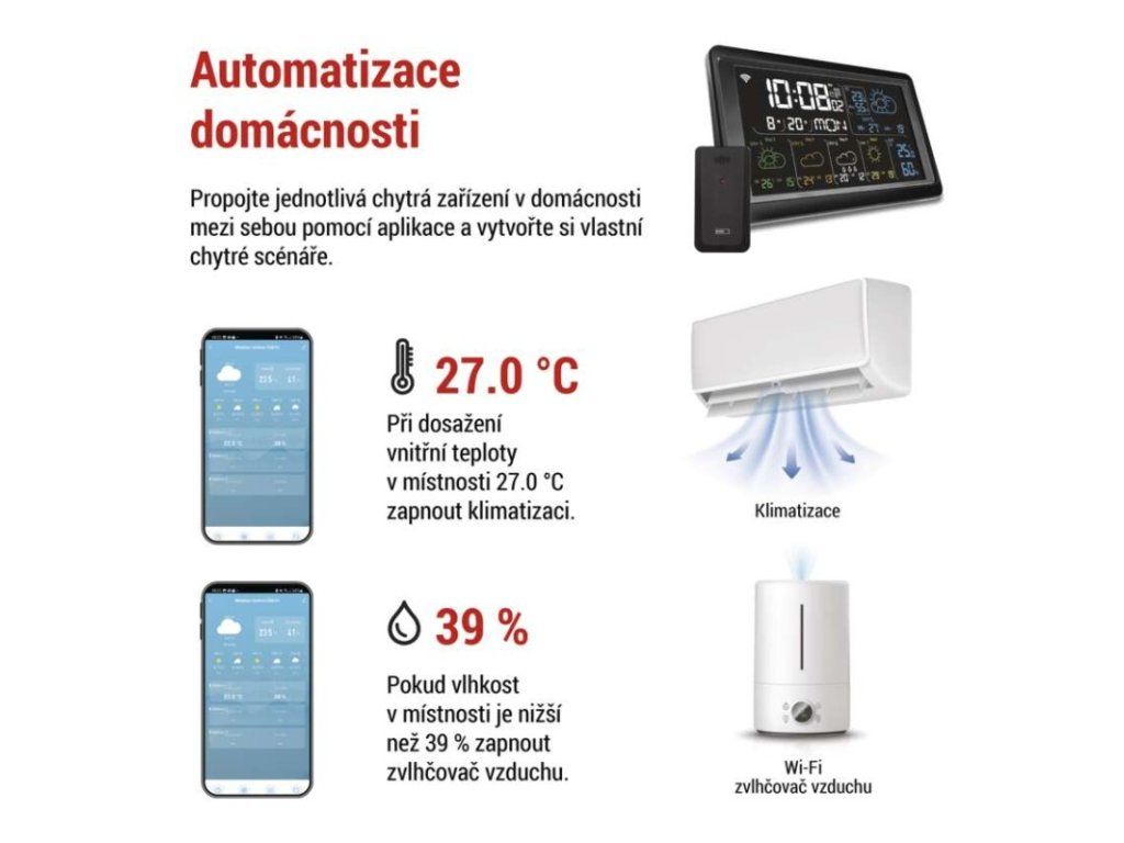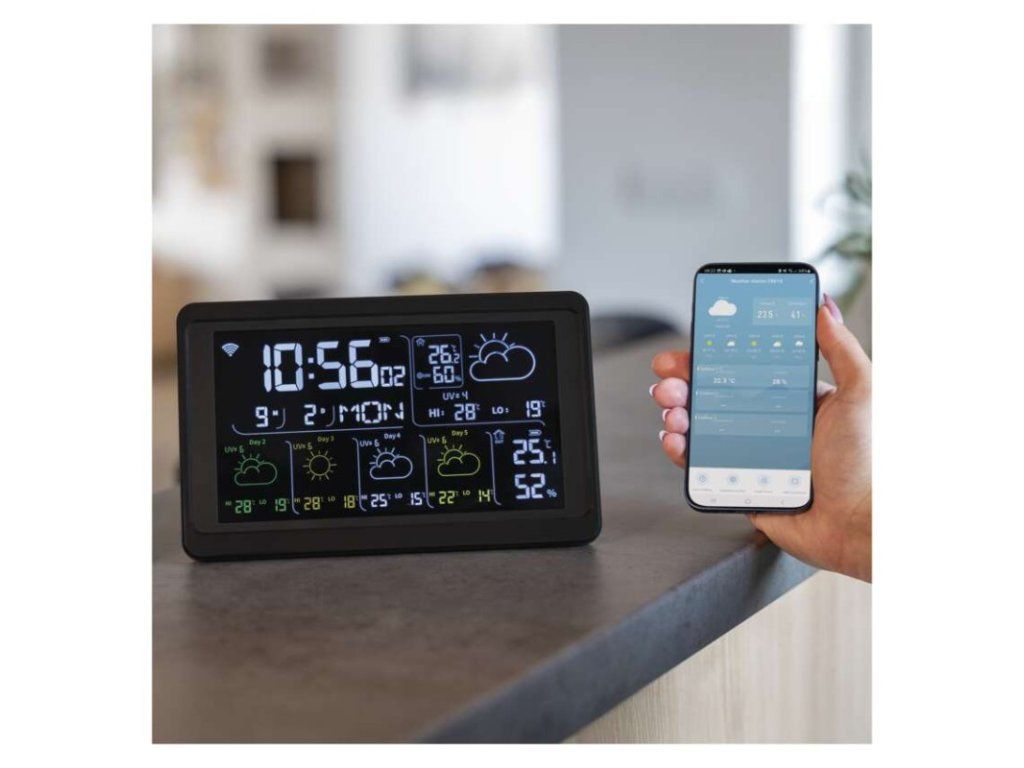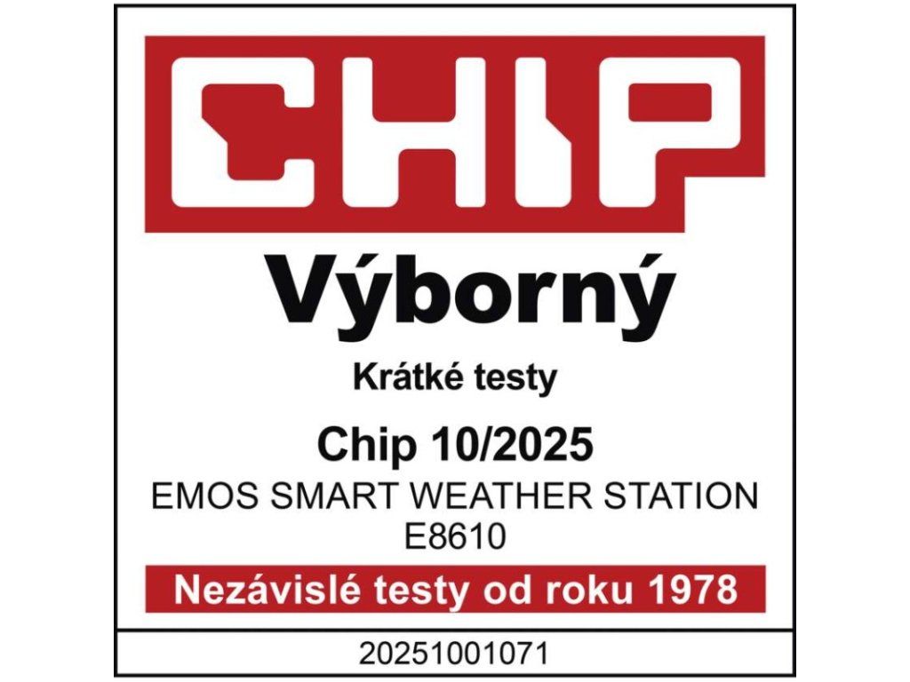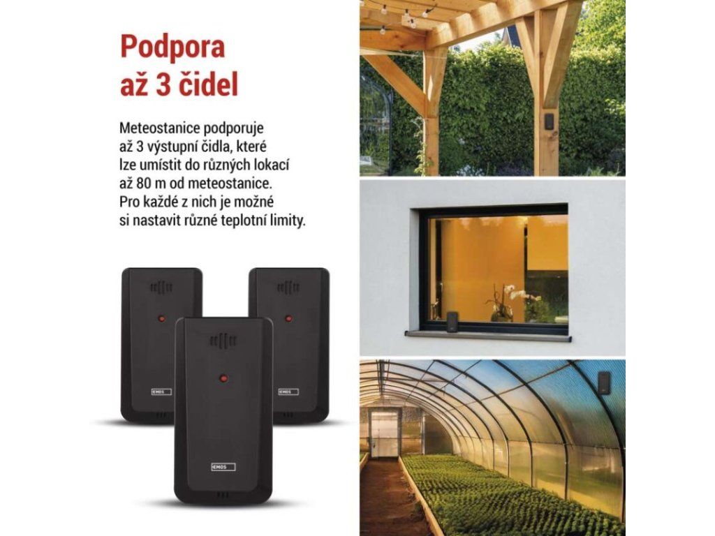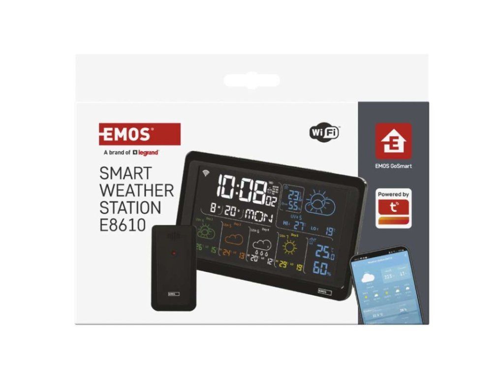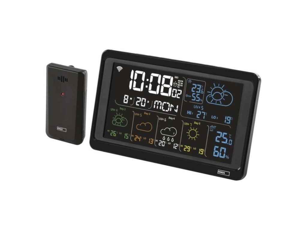 12/24 formát času: ano|anemometr: ne|barevný displej (black mask) podsvícený: ano|barometr: ne|budík: ano|časová pásma: ne|další funkce: USB–A napájecí výstup|datum: ano|dosah čidla: až 80 m|drátová sonda k čidlu: ne|elektronické plošné podsvícení: ano|fáze měsíce: ne|hodiny: řízené wifi|kalendář: ano|kompatibilita: EMOS GoSmart, TUYA, LIDL, Smartlife, Otevřený systém|korekce nadmořské výšky: ne|LED podsvícení displeje: ano|min. a max. teplota: ano|možné další čidlo: až 3 čidla (E00387, E05018)|možnost nastavení jednotky teploty: °C/°F|možnost pověšení na zeď: ano|napájení čidla: 2× 1,5 V AAA (nejsou součástí balení)|napájení stanice: 3× 1,5 V AAA (nejsou součástí balení)|notifikace do mobilní aplikace: ano|opakované buzení: ano|ovládání hlasovými asistenty: ne|podporované OS: Android, iOS|předpověď počasí: ano|přenosová frekvence: 433 MHz|prodejní obal: 1 ks, krabička|produkt: meteostanice|projekce: ne|protokol: Wi-Fi|provedení: bezdrátové – smart|rozměr čidla: 50 × 25 × 95 mm|rozměr hlavní jednotky: 205 × 29 × 127 mm|síťový adaptér: ano, 5 V DC/1 000 mA (součástí balení)|srážkoměr: ne|teplotní výstraha: ano|trend teploty: ano|trend tlaku: ne|trvalé podsvícení: ano|velikost displeje: 169 × 95 mm|venkovní teplota: -40 °C až +70 °C, rozlišení 0,1 °C|venkovní vlhkost: 20 % až 95 % RV, rozlišení 1 %|vnitřní teplota: -10 °C až +50 °C, rozlišení 0,1 °C|vnitřní vlhkost: 20 % až 95 % RV, rozlišení 1 %
