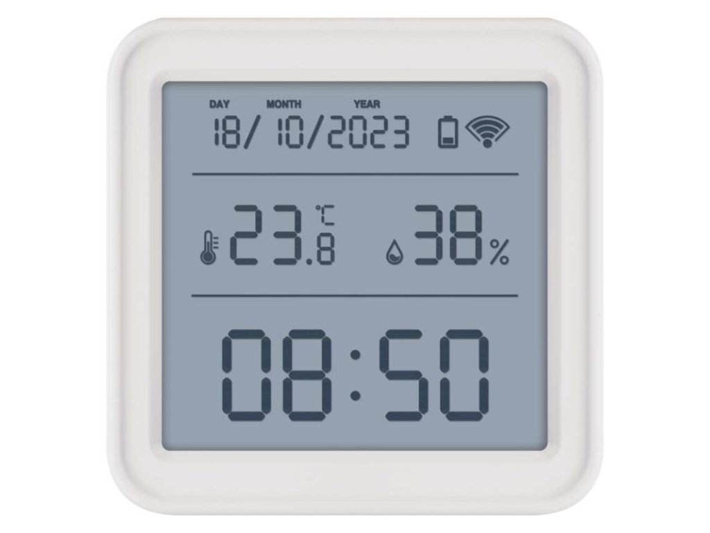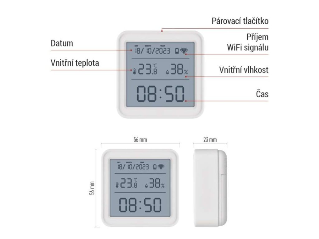 12/24 formát času: ano|barevný displej (black mask) podsvícený: ne|budík: ne|časová pásma: ne|další funkce: –|datum: ano|dosah ve volném prostoru: ne|drátová sonda k čidlu: ne|funkce stopky: ne|hlasová komunikace: –|hodiny: řízené wifi|instalační materiál: –|jazyky aplikace: EN, CZ, SK, PL, DE, HU, SI, FR, + 60 dalších jazyků|kalendář: ne|kompatibilita: EMOS GoSmart, TUYA, LIDL, Smartlife, Otevřený systém|LED podsvícení displeje: ano|magnet na připevnění: ne|min. a max. teplota: ano|možné další čidlo: ne|možnost nastavení jednotky teploty: ano|možnost pověšení na zeď: ano|napájení čidla: ne|napájení stanice: 3× 1,5 V AAA (nejsou součástí balení)|notifikace do mobilní aplikace: ano|odpočet času max. od: ne|opakované buzení: ne|ovládání hlasovými asistenty: ano (Amazon Alexa, Google Assistant)|paměť poslední hodnoty: ne|podporované OS: Android, iOS|přenosová frekvence: ne|prodejní obal: 1 ks, krabička|protokol: Zigbee 3.0|provedení teploměru: bezdrátové – smart|rozměr čidla: ne|rozměr hlavní jednotky: 56 × 23 × 56 mm|síťový adaptér: ne|teplotní index: ne|teplotní výstraha: ano|trend teploty: ne|trend tlaku: ne|trvalé podsvícení: ne|velikost displeje: 42 × 40 mm|venkovní teplota: ne|venkovní vlhkost: ne|vnitřní teplota: -10 °C až +60 °C, rozlišení 0,1 °C|vnitřní vlhkost: 0 % až 99 % RV, rozlišení 1 %