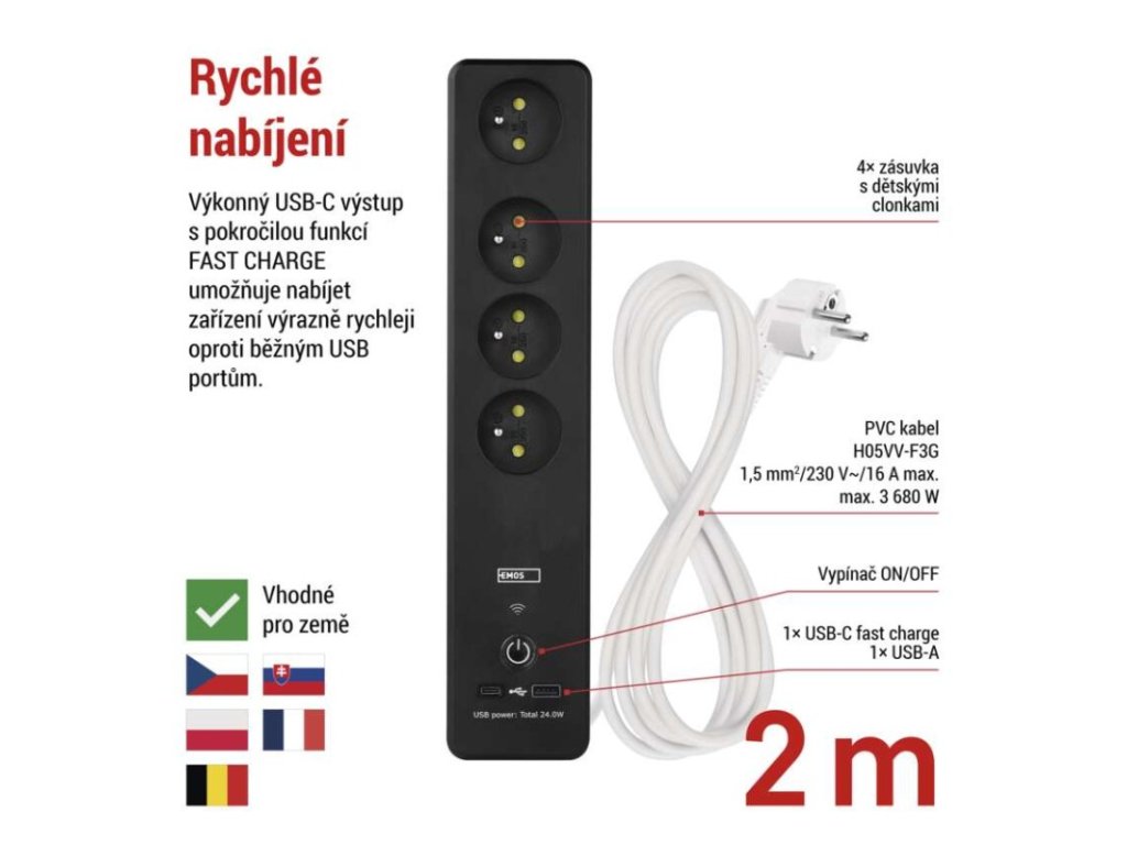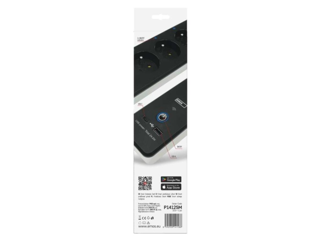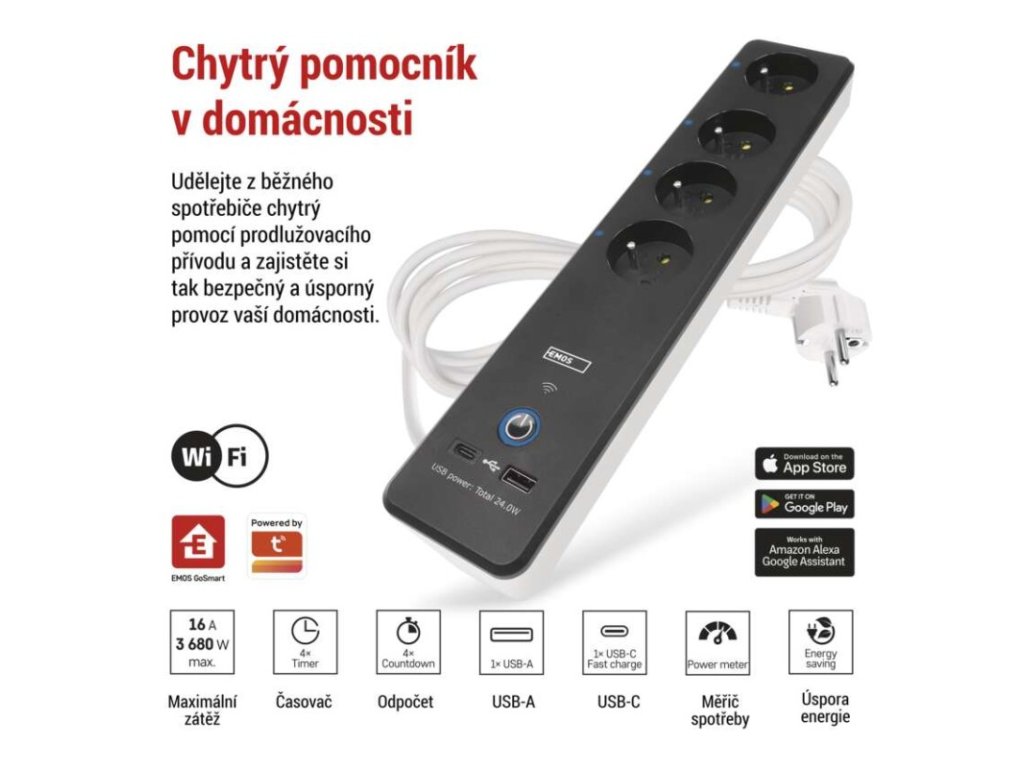 barva: bílá/černá|další funkce: wattmetr, časovač, countdown|délka: 2 m|dětské clonky: ano|jazyky aplikace: EN, CZ, SK, PL, DE, HU, SI, FR, + 60 dalších jazyků|kompatibilita: EMOS GoSmart, TUYA, LIDL, Smartlife, Otevřený systém|krytí: IP20|materiál zásuvky a vidlice: plast|max. zátěž: 3 680 W|napětí: 250 V~|notifikace do mobilní aplikace: ano|ovládání hlasovými asistenty: ano (Amazon Alexa, Google Assistant)|počet zásuvek: 4× 2P + PE|podporované OS: Android, iOS|přenosová frekvence: 2,4 GHz WIFI|prodejní obal: 1 ks, krabice|protokol: Wi-Fi|proud: 16 A max.|průřez vodiče: 1,5 mm²|typ izolace: PVC|USB výstup: 1× USB-A 2,1 A, 1× USB-C 3 A (QC 2.0) total: 24 W|vodič: H05VV-F3G|vypínač: ano