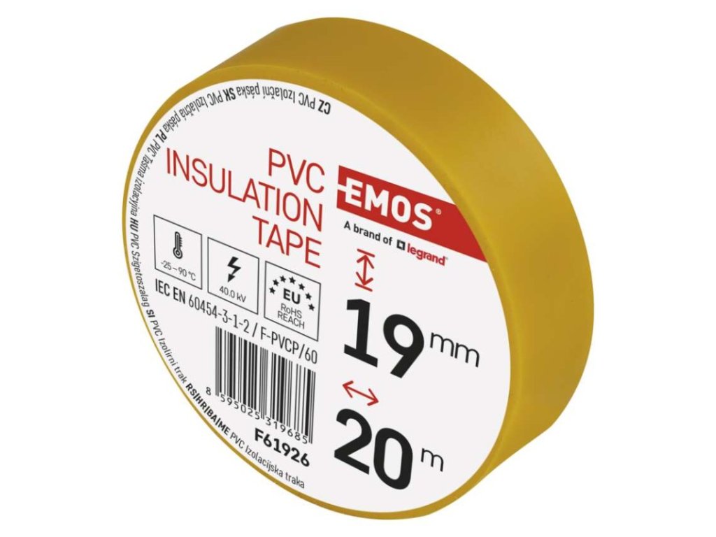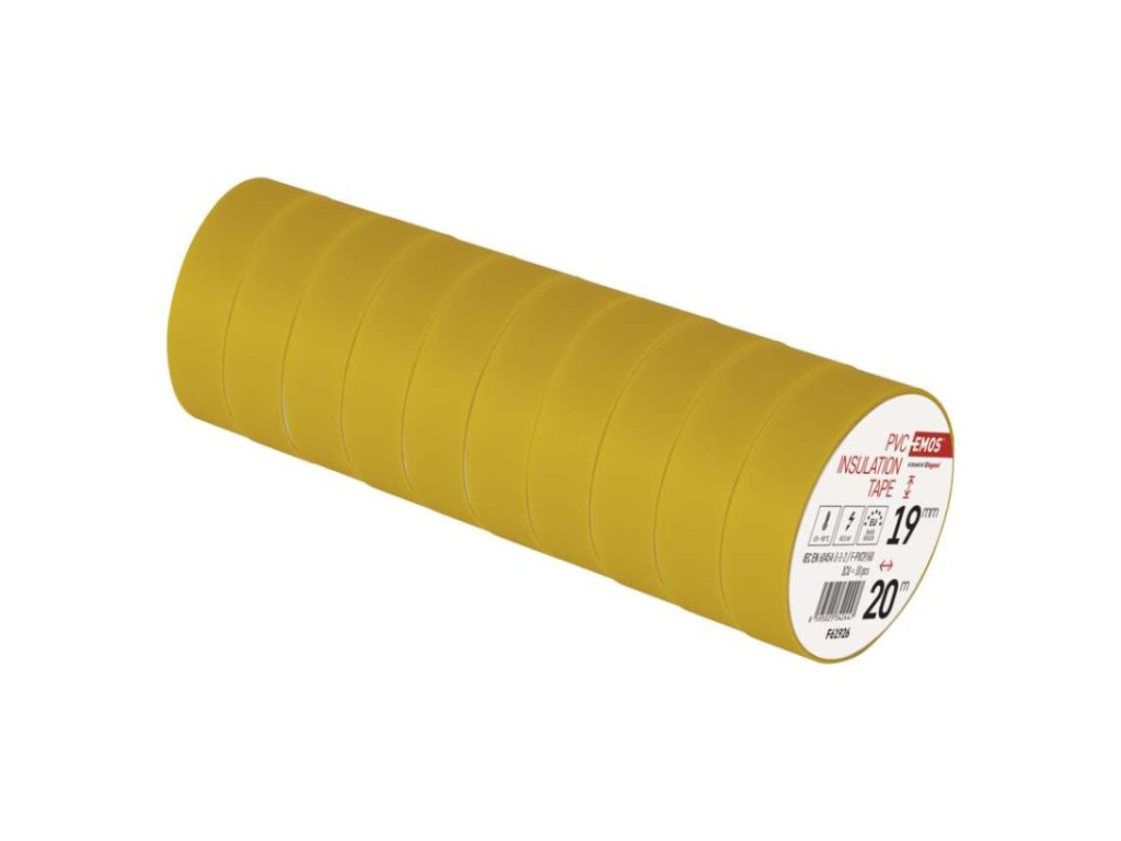 barva: žlutá|délka návinu: 20 m|doporučená skladovací teplota: 10–45 °C|elektrická pevnost minimálně: 40 kV/mm|elektrická pevnost po vlhku minimálně: 35 kV/mm|integrovaná textilní síťka: ne|materiál lepidla: kaučuk|odolné UV: ano|pevnost v tahu: 150 N/10 mm|potisk: bez potisku|předpokládané použití: izolace kabelů|přilnavost k oceli minimálně: 1,8 N/10 mm|přilnavost k podkladu: 1,5 N/10 mm|prodejní obal: 10 ks, fólie|prodloužení minimálně: 125 %|rozměr: 70 × 20 mm|rozsah instalačních teplot: -25–90 °C|samozhášivé: ne|šířka pásky: 19 mm|splňuje směrnici REACH: ano|splňuje směrnici ROHS: ano|tloušťka pásky: 0,13 mm|typ pásky: PVC|vodotěsný spoj: ano|vyhovuje normě: ČSN EN 60454-3-1-2/F-PVC/60|vytváří tlakotěsný spoj: ne|zkouška plamenem: <1 sec