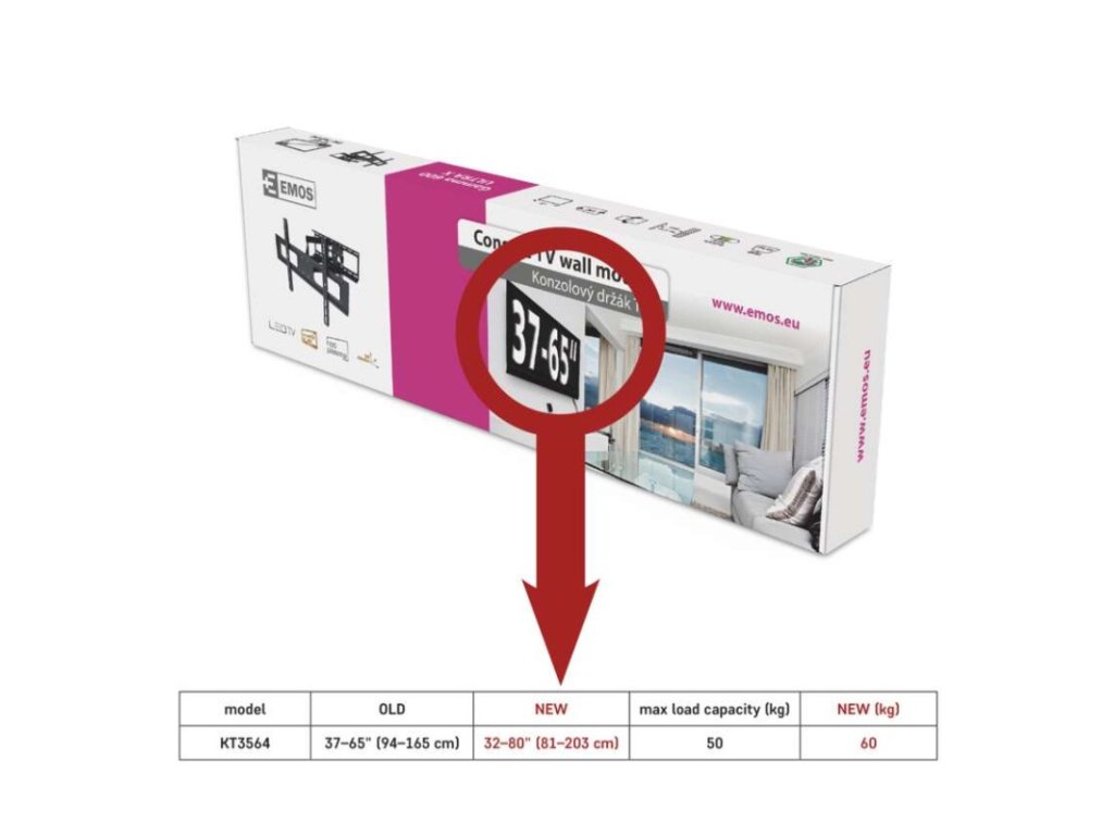 druh držáku: konzolový|garantované rozmezí rozteče obrazovky: 32–80" (81–203 cm)|max. montážní rozměry VESA: 600 × 400 mm|max. nosnost (kg): 60|min. montážní rozměry VESA: 200 × 200 mm|naklopení: +/-15°|prodejní obal: 1 ks, papírová krabice|profil od stěny: 76–510 mm|rotace: +/-3°|rozměr: 510 × 650 × 204 mm|vodováha součástí balení: ano|vyrovnání: ne|vytočení: +/- 90°|způsob fixace: šroubek