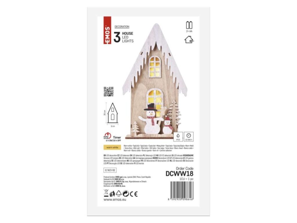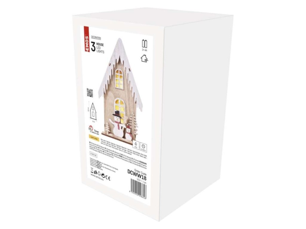 barva drátu: neuvádí se|barva světla: teplá bílá|časovač: ano|dálkový ovladač: ne|délka přívodu: neuvádí se|krytí: IP20|materiál: dřevo|počet LED: 3|použití: vnitřní|příkon: 0,2 W|prodejní obal: 1 ks, krabice|produkt: domeček|rozměr: 16 × 11,5 × 28,5 cm|typ napájení: baterie 2× AA (není součástí balení)|vstupní napětí: neuvádí se|výstupní napětí: 3 V DC|záruční doba: 2 roky|zdroj svícení: LED|životnost: 10 000 hodin