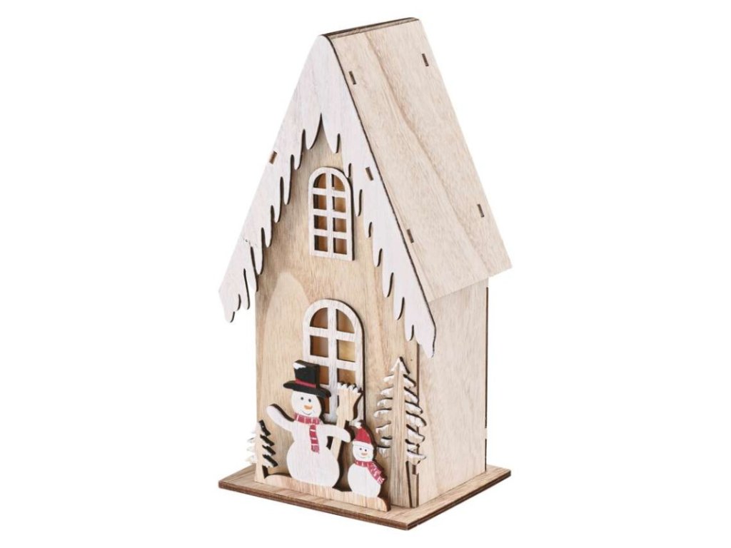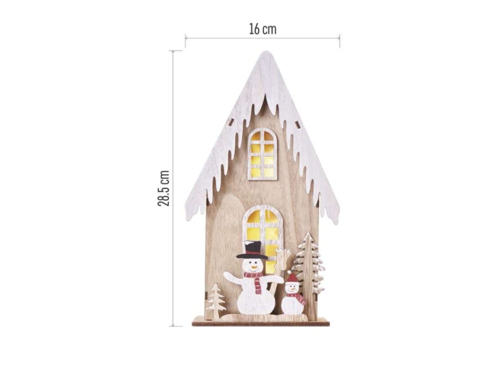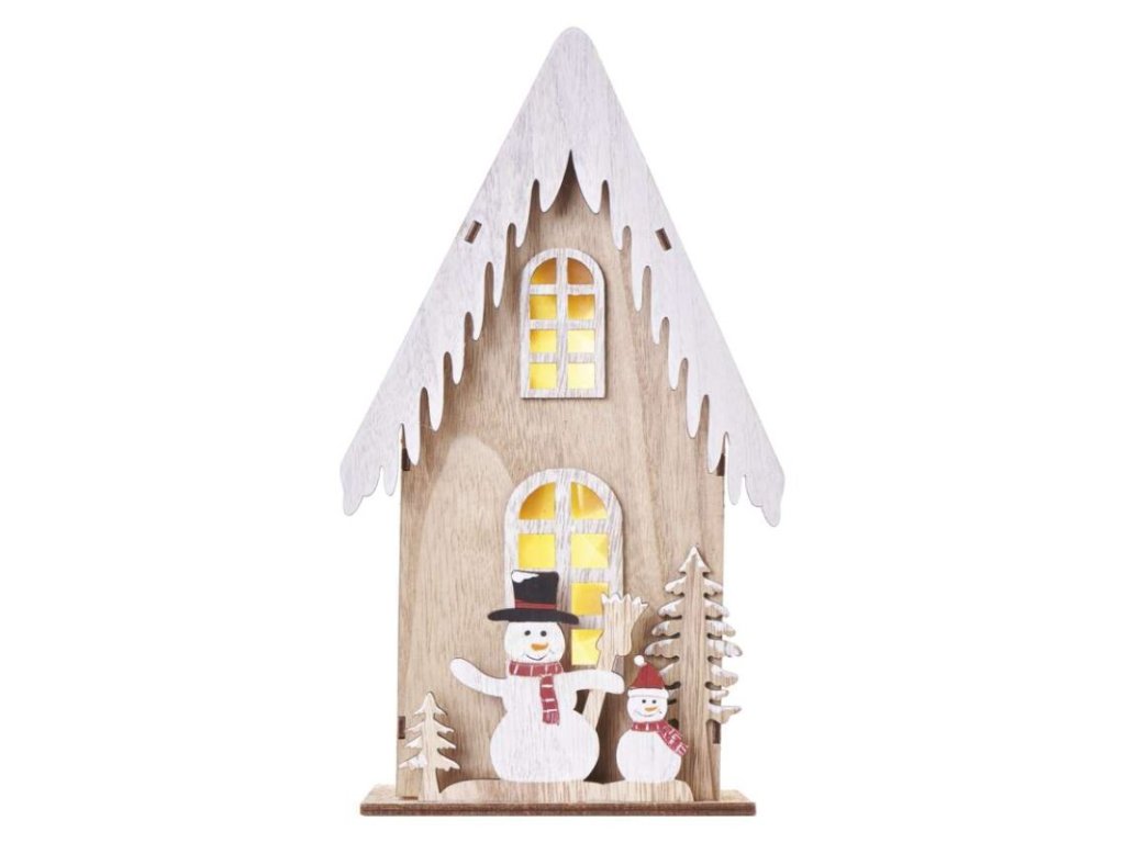 LED dekorace dřevěná – domek se sněhuláky, 28,5 cm, 2x AA, vnitřní, teplá bílá, časovač