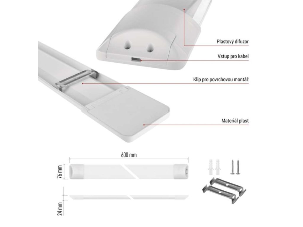 barva světla: neutrální bílá|barva těla: bílá|frekvence: 50/60 Hz|index podání barev (CRI): Ra >80|krytí: IP20|materiál: plast (PC)|materiál difuzoru: plast (PC)|materiál spon: nemá spony|materiál těla: plast (PC)|možnost stmívání: ne|náhrada za žárovku: neuvádí se|napětí: 220–240 V~|příkon: 20 W|prodejní obal: 1 ks, krabice|proud: 150 mA|průběžná montáž: neuvádí se|rozměr: 600 × 75,5 × 24,5 mm|rozsah pracovní teploty: -20 °C až +40 °C|stupeň ochrany proti mechanickým nárazům: IK06|světelný tok: 2 200 lm|světelný tok v nouzovém režimu: neuvádí se|teplota chromatičnosti: 4 000 K|třída ochrany: II|typ difuzoru: mléčný|typ montáže: přisazená|typ řízení: neuvádí se|úhel vyzařování: 120°|výdrž baterie: neuvádí se|záruční doba: 2 roky|záruka na baterii: neuvádí se|zdroj světla: LED|životnost: 25 000 hodin