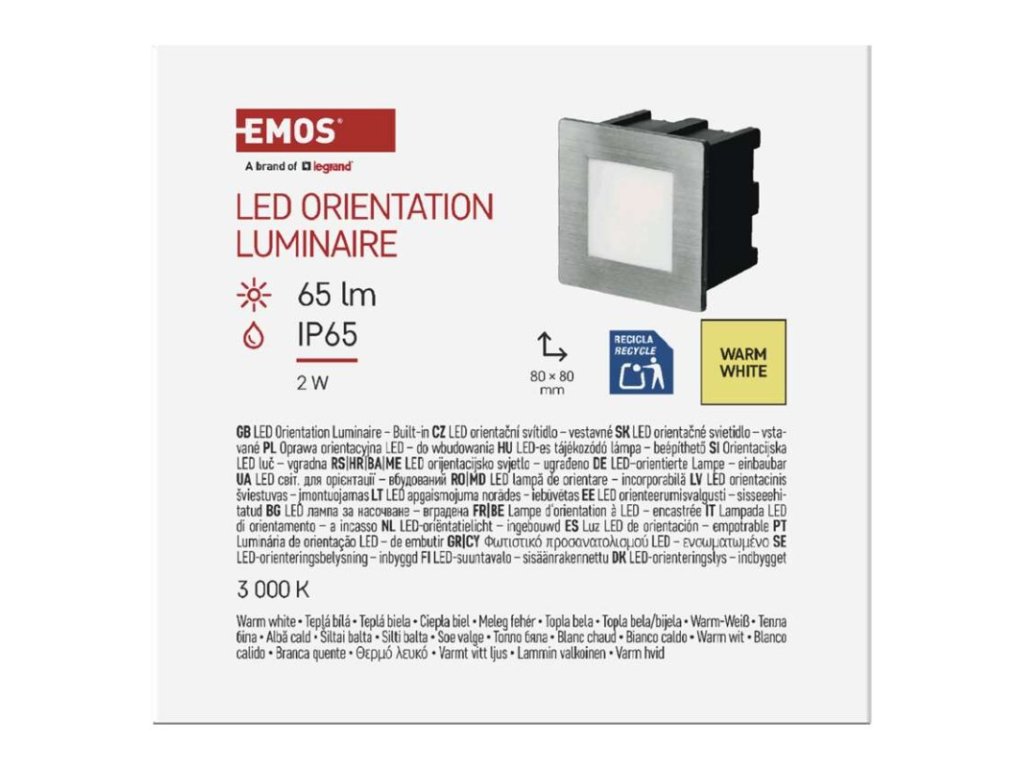 barva: nerez|barva světla: teplá bílá|energetická třída (od 1.9.2021): F|frekvence: 50–60 Hz|krytí: IP65|materiál difuzoru: sklo|materiál těla: hliník|montážní otvor: 75 × 70 mm|možnost stmívání: ne|napětí: 220–240 V|příkon: 2 W|prodejní obal: 1 ks, krabice|rozměr: 80 × 80 × 61 mm|rozsah pracovní teploty: -20~+60 °C|světelný tok: 65 lm|teplota chromatičnosti: 3 000 K|záruční doba: 2 roky|zdroj světla: LED|životnost: 30 000 hodin