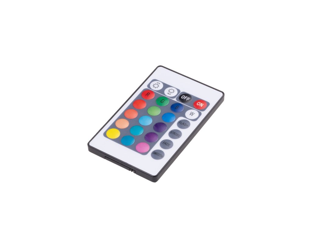 Popis ovládání: 24 tlačítek, 7 přednastavených barev, 5 předvoleb pro nastavení vlastní barvy s možností nastavení automatického přepínání těchto nastavených barev, přepínání 3 nebo 7 barev, prolínání 3 nebo 7 barev, možnost nastavení rychlosti efektů a intenzity jasu při statické barvě.