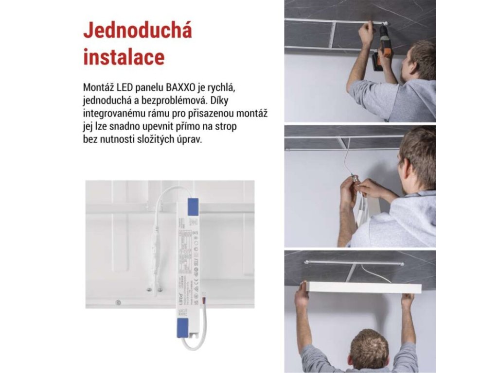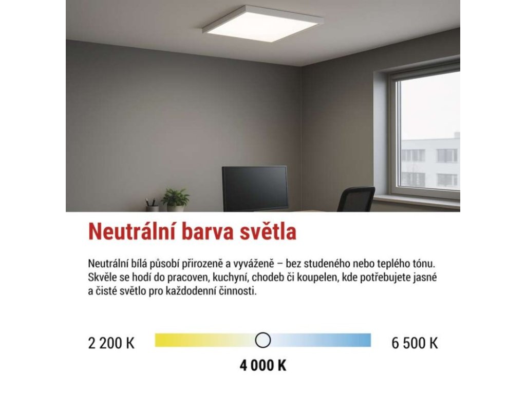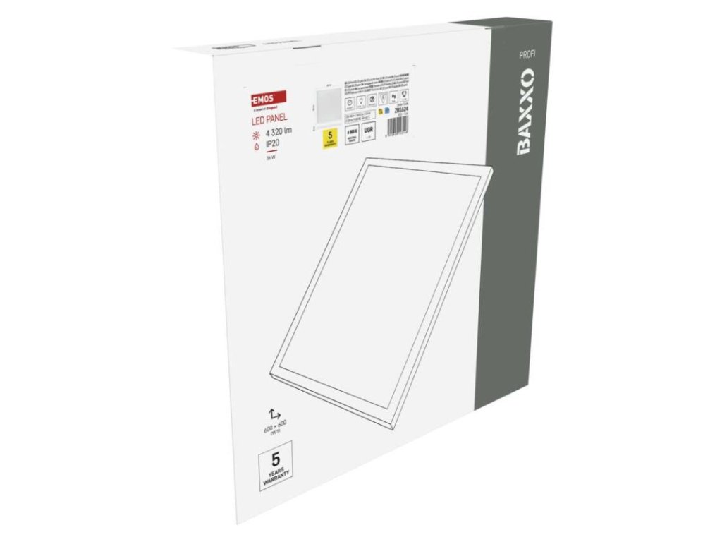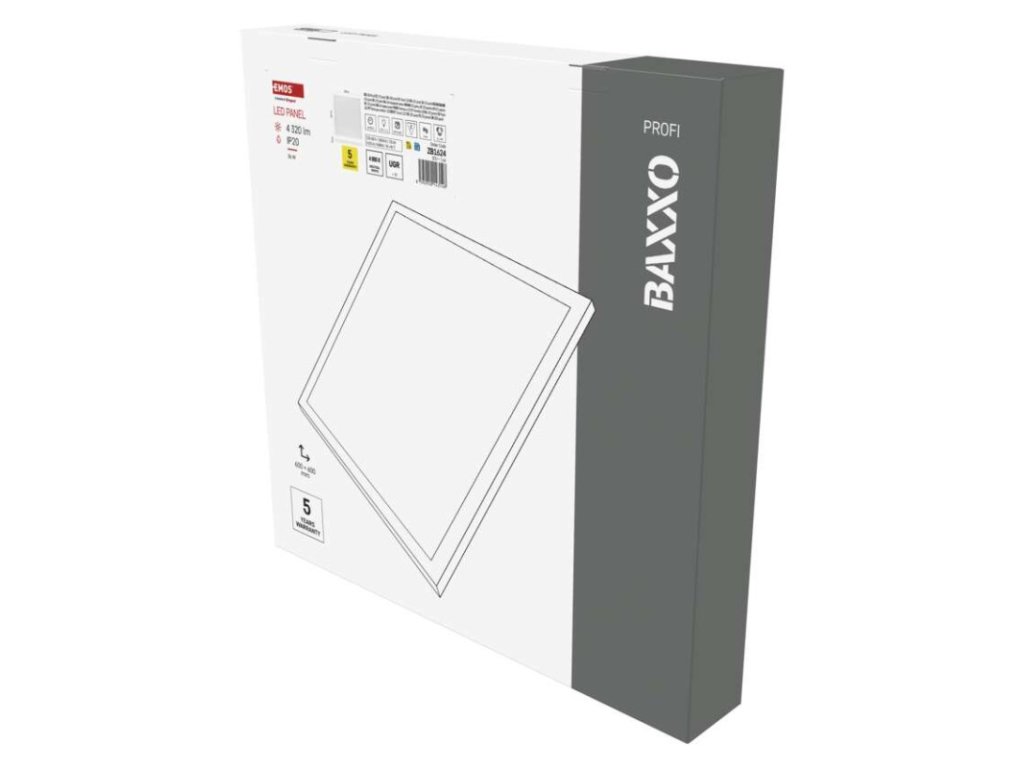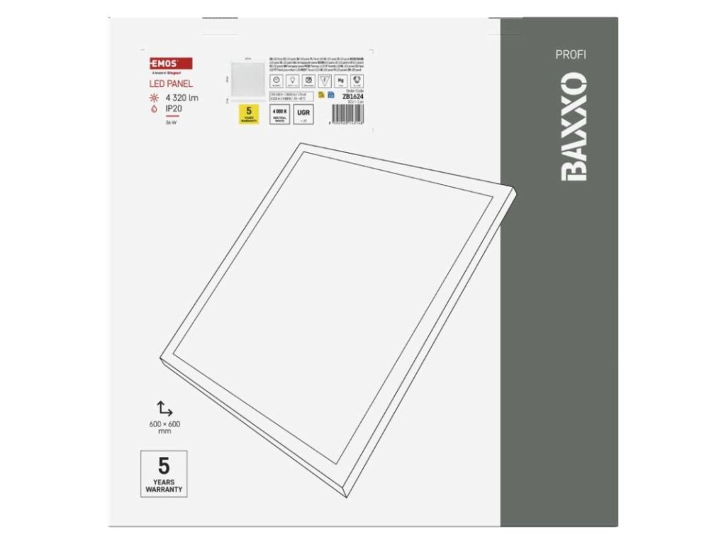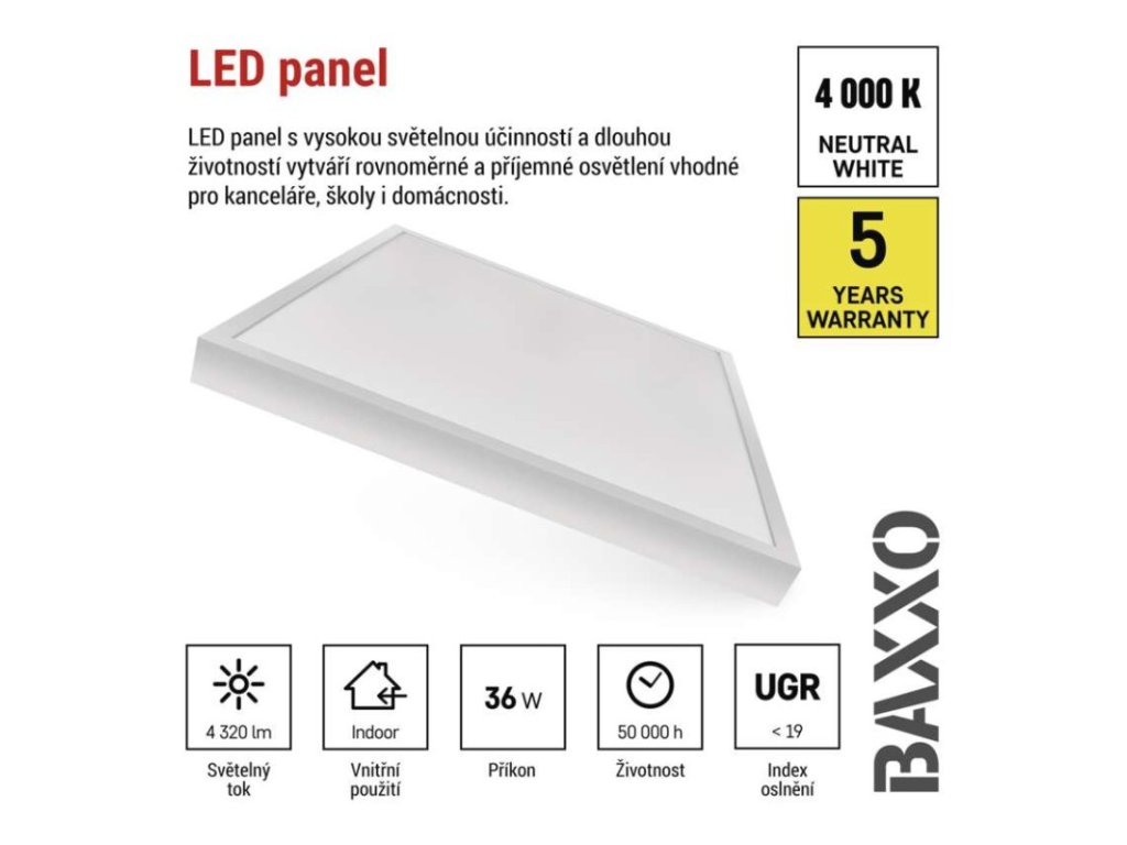 barva světla: neutrální bílá|barva těla: bílá|dálkový ovladač: ne|další funkce: –|do chodby a na schodiště: ano|do dílny a garáže: ne|do kanceláře: ano|do koupelny: ne|do kuchyně: ano|do obýváku, ložnice a dětského pokoje: ano|dosah senzoru: nemá senzor|flicker-free: ano|frekvence: 50/60 Hz|index podání barev (CRI): Ra > 80|jazyky aplikace: –|kategorie: PROFI|kompatibilita: –|krytí: IP20|materiál difuzoru: plast (PS)|materiál LGP: –|materiál těla: ocelový plech|montážní otvor: –|možnost stmívání: ne|náhrada za žárovku: 4× 18 W CFL|napětí: 220–240 V~|na zahradu a balkon: ne|notifikace do mobilní aplikace: ne|obsah balení: –|ovládání hlasovými asistenty: ne|podporované OS: –|pohybový senzor: ne|přenosová frekvence: –|příkon: 36 W|prodejní obal: 1 ks, krabice|protokol: –|proud: 170 mA|řada: BAXXO|rozměr: 600 × 600 × 50 mm|světelná účinnost: 120 lm/W|světelný tok: 4 320 lm|teplota chromatičnosti: 4 000 K|tvar: čtverec|typ difuzoru: mikroprizmatický|typ svítidla: panel|účiník: > 0,9|UGR<: 19|úhel vyzařování: 90°|umístění: stropní/nástěnné|výstupní proud ze zdroje: 950 mA|záruční doba: 5 let|zdroj světla: LED|životnost: 50 000 hodin|způsob montáže: přisazené