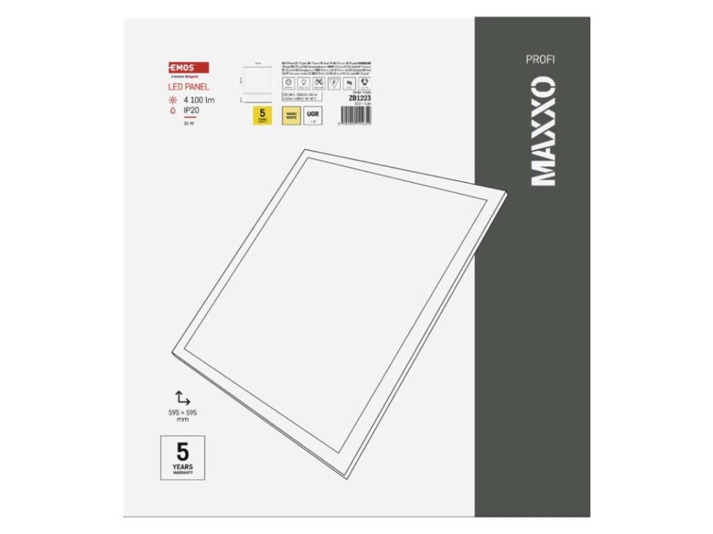 barva světla: teplá bílá|barva těla: bílá|dálkový ovladač: ne|další funkce: –|do chodby a na schodiště: ne|do dílny a garáže: ne|do kanceláře: ano|do koupelny: ne|do kuchyně: ne|do obýváku, ložnice a dětského pokoje: ano|dosah senzoru: nemá senzor|flicker-free: ano|frekvence: 50/60 Hz|index podání barev (CRI): Ra > 80|jazyky aplikace: –|kategorie: PROFI|kompatibilita: –|krytí: IP20|materiál difuzoru: plast (PS)|materiál LGP: PMMA|materiál těla: hliník|montážní otvor: neuvádí se|možnost stmívání: ne|náhrada za žárovku: 4× 18 W CFL|napětí: 220–240 V|na zahradu a balkon: ne|notifikace do mobilní aplikace: ne|obsah balení: –|ovládání hlasovými asistenty: ne|podporované OS: –|pohybový senzor: ne|přenosová frekvence: –|příkon: 36 W|prodejní obal: 1 ks, krabice|protokol: –|proud: 155 mA|řada: MAXXO|rozměr: 595 × 595 × 10 mm|světelná účinnost: 114 lm/W|světelný tok: 4 100 lm|teplota chromatičnosti: 3 000 K|tvar: čtverec|typ difuzoru: mikroprizmatický|typ svítidla: panel|účiník: > 0,9|UGR<: 19|úhel vyzařování: 90°|umístění: stropní|výstupní proud ze zdroje: 900 mA|záruční doba: 5 let|zdroj světla: LED|životnost: 50 000 hodin|způsob montáže: vestavné