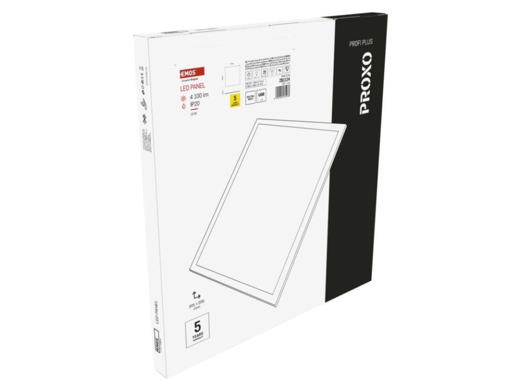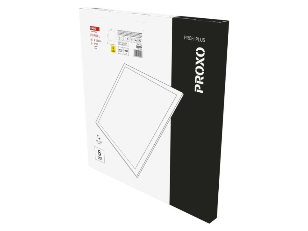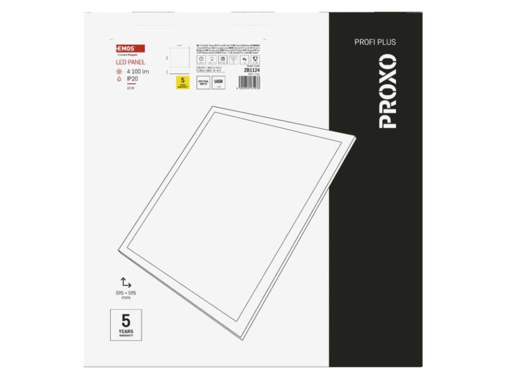 barva světla: neutrální bílá|barva těla: bílá|dálkový ovladač: ne|další funkce: –|do chodby a na schodiště: ne|do dílny a garáže: ne|do kanceláře: ano|do koupelny: ne|do kuchyně: ne|do obýváku, ložnice a dětského pokoje: ne|dosah senzoru: nemá senzor|flicker-free: ano|frekvence: 50/60 Hz|index podání barev (CRI): Ra > 80|jazyky aplikace: –|kategorie: PROFI PLUS|kompatibilita: –|krytí: IP20|materiál difuzoru: plast (PC)|materiál LGP: PMMA|materiál těla: hliník|montážní otvor: –|možnost stmívání: ne|náhrada za žárovku: 4× 18 W CFL|napětí: 220–240 V~|na zahradu a balkon: ne|notifikace do mobilní aplikace: ne|obsah balení: –|ovládání hlasovými asistenty: ne|podporované OS: –|pohybový senzor: ne|přenosová frekvence: –|příkon: 33 W|prodejní obal: 1 ks, krabice|protokol: –|proud: 150 mA|řada: PROXO|rozměr: 595 × 595 × 10 mm|světelná účinnost: 124 lm/W|světelný tok: 4 100 lm|teplota chromatičnosti: 4 000 K|tvar: čtverec|typ difuzoru: mikroprizmatický|typ svítidla: panel|účiník: > 0,9|UGR<: 19|úhel vyzařování: 90°|umístění: stropní|výstupní proud ze zdroje: 900 mA|záruční doba: 5 let|zdroj světla: LED|životnost: 50 000 hodin|způsob montáže: vestavné
