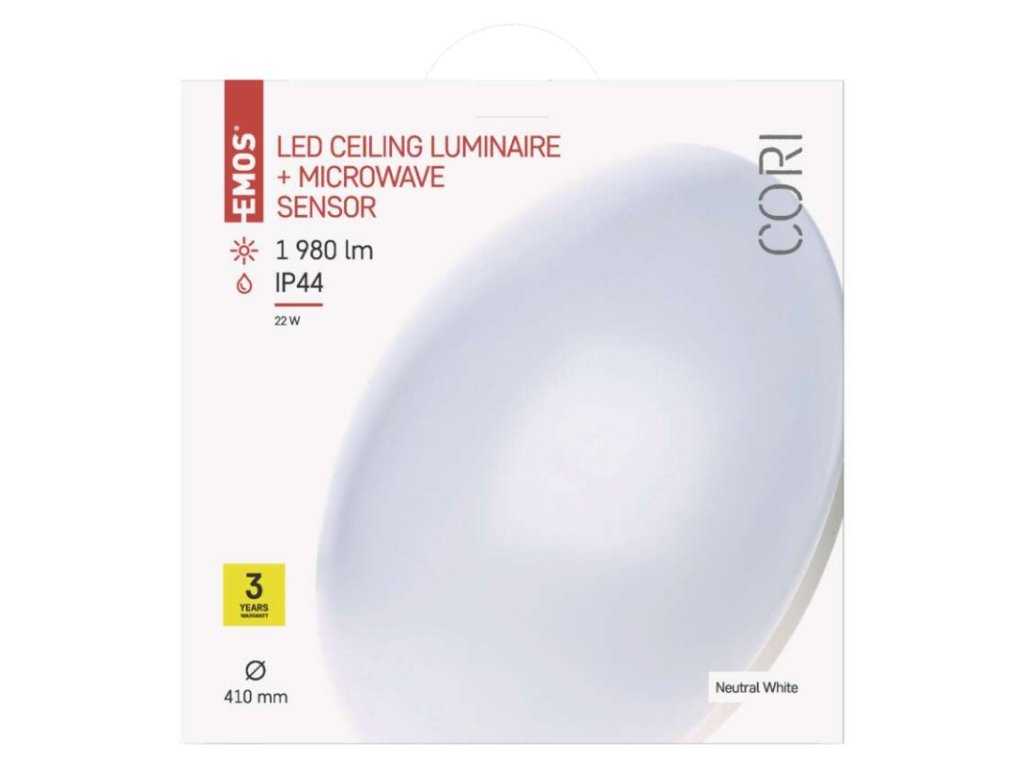 barva světla: neutrální bílá|barva těla: bílá|dálkový ovladač: ne|do chodby a na schodiště: ano|do dílny a garáže: ano|do kanceláře: ano|do koupelny: ano|do kuchyně: ano|do obýváku, ložnice a dětského pokoje: ne|dosah senzoru: 6 m|flicker-free: ano|frekvence: 50/60 Hz|index podání barev (CRI): Ra > 80|kategorie: CLASSIC|krytí: IP44|materiál difuzoru: plast (PMMA)|materiál LGP: neuvádí se|materiál těla: ocelový plech|montážní otvor: neuvádí se|možnost stmívání: ne|náhrada za žárovku: 125 W|napětí: 220–240 V|na zahradu a balkon: ano|pohybový senzor: MW|příkon: 22 W|prodejní obal: 1 ks, krabice|proud: 170 mA|řada: CORI|rozměr: průměr 410 × 115 mm|světelná účinnost: 90 lm/W|světelný tok: 1 980 lm|teplota chromatičnosti: 4 000 K|tvar: kruh|typ difuzoru: mléčný|typ svítidla: klasické svítidlo|účiník: > 0,5|UGR<: neuvádí se|úhel vyzařování: 120°|umístění: stropní/nástěnné|výstupní proud ze zdroje: neuvádí se|záruční doba: 3 roky|zdroj světla: LED|životnost: 30 000 hodin|způsob montáže: přisazené