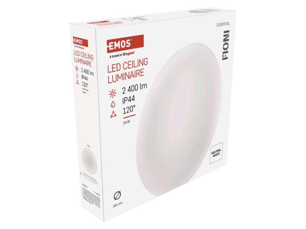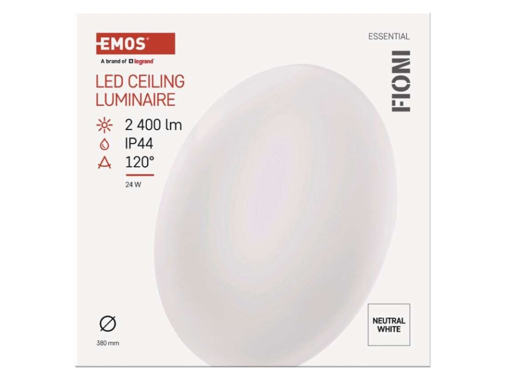 barva světla: neutrální bílá|barva těla: bílá|dálkový ovladač: ne|další funkce: –|do chodby a na schodiště: ano|do dílny a garáže: ano|do kanceláře: ne|do koupelny: ne|do kuchyně: ano|do obýváku, ložnice a dětského pokoje: ne|dosah senzoru: neuvádí se|flicker-free: ano|frekvence: 50/60 Hz|index podání barev (CRI): Ra > 80|jazyky aplikace: –|kategorie: ESSENTIAL|kompatibilita: –|krytí: IP44|materiál difuzoru: plast (PMMA)|materiál LGP: neuvádí se|materiál těla: ocelový plech|montážní otvor: ne|možnost stmívání: ne|náhrada za žárovku: 150 W|napětí: 220–240 V|na zahradu a balkon: ano|notifikace do mobilní aplikace: ne|obsah balení: –|ovládání hlasovými asistenty: ne|podporované OS: –|pohybový senzor: ne|přenosová frekvence: –|příkon: 24 W|prodejní obal: 1 ks, krabice|protokol: –|proud: 156 mA|řada: FIONI|rozměr: průměr 390 × 80 mm|světelná účinnost: 100 lm/W|světelný tok: 2 400 lm|teplota chromatičnosti: 4 000 K|tvar: kruh|typ difuzoru: mléčný|typ svítidla: klasické svítidlo|účiník: > 0,5|UGR<: neuvádí se|úhel vyzařování: 120°|umístění: stropní/nástěnné|výstupní proud ze zdroje: neuvádí se|záruční doba: 2 roky|zdroj světla: LED|životnost: 15 000 hodin|způsob montáže: přisazené