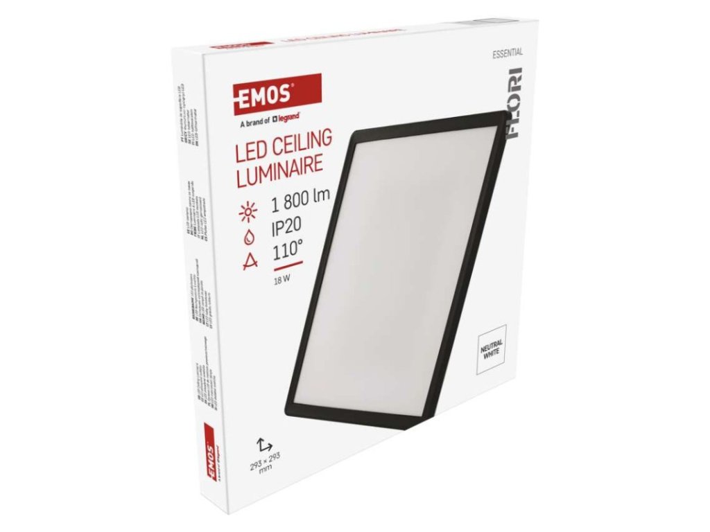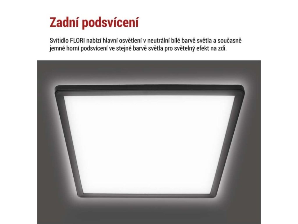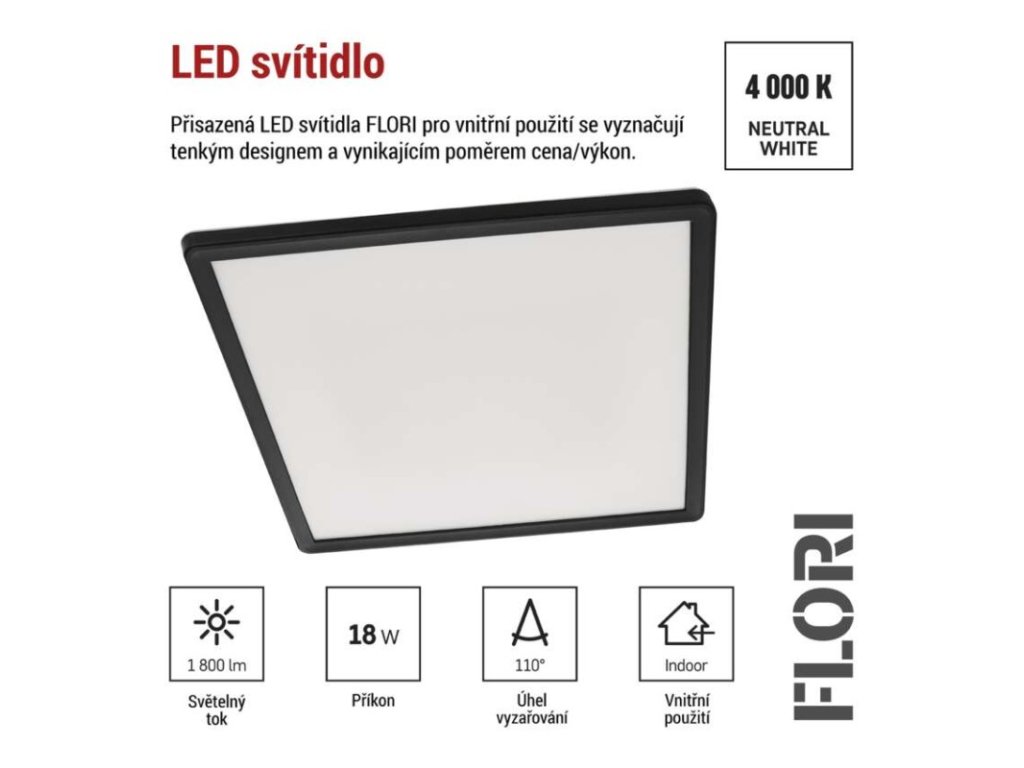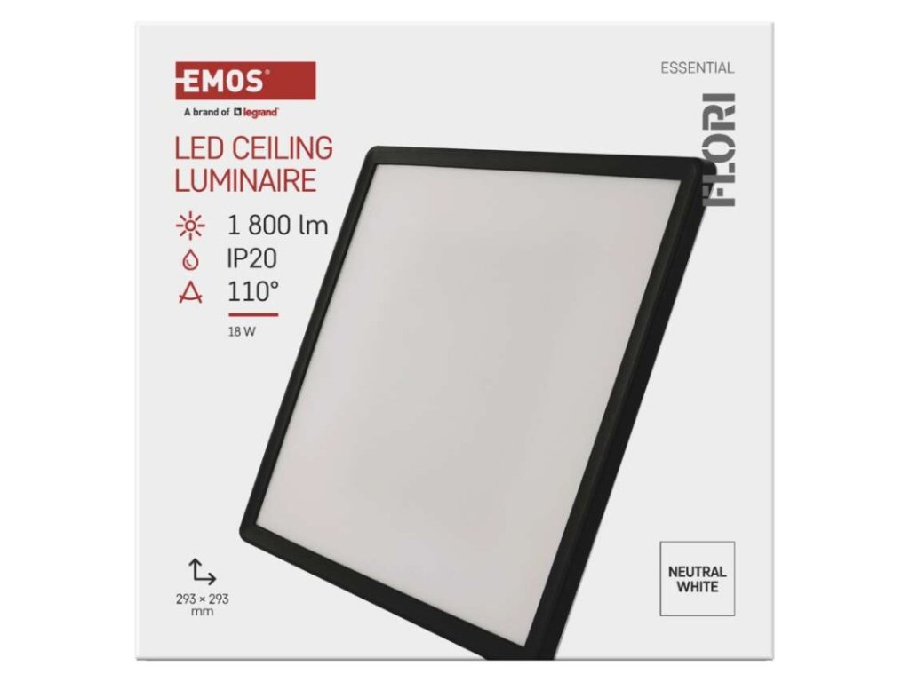 barva světla: neutrální bílá|barva těla: černá|dálkový ovladač: ne|do chodby a na schodiště: ano|do dílny a garáže: ne|do kanceláře: ne|do koupelny: ne|do kuchyně: ano|do obýváku, ložnice a dětského pokoje: ano|dosah senzoru: neuvádí se|flicker-free: neuvádí se|frekvence: 50/60 Hz|index podání barev (CRI): Ra > 80|kategorie: ESSENTIAL|krytí: IP20|materiál difuzoru: plast|materiál LGP: neuvádí se|materiál těla: plast|montážní otvor: neuvádí se|možnost stmívání: ne|náhrada za žárovku: 115 W|napětí: 220–240 V~|na zahradu a balkon: ne|pohybový senzor: ne|příkon: 18 W|prodejní obal: 1 ks, krabice|proud: 134 mA|řada: FLORI|rozměr: 293 × 293 × 29 mm|světelná účinnost: 100 lm/W|světelný tok: 1 800 lm|teplota chromatičnosti: 4 000 K|tvar: čtverec|typ difuzoru: mléčný|typ svítidla: klasické svítidlo|účiník: > 0,5|UGR<: neuvádí se|úhel vyzařování: 110°|umístění: stropní/nástěnné|výstupní proud ze zdroje: neuvádí se|záruční doba: 2 roky|zdroj světla: LED|životnost: 15 000 hodin|způsob montáže: přisazené