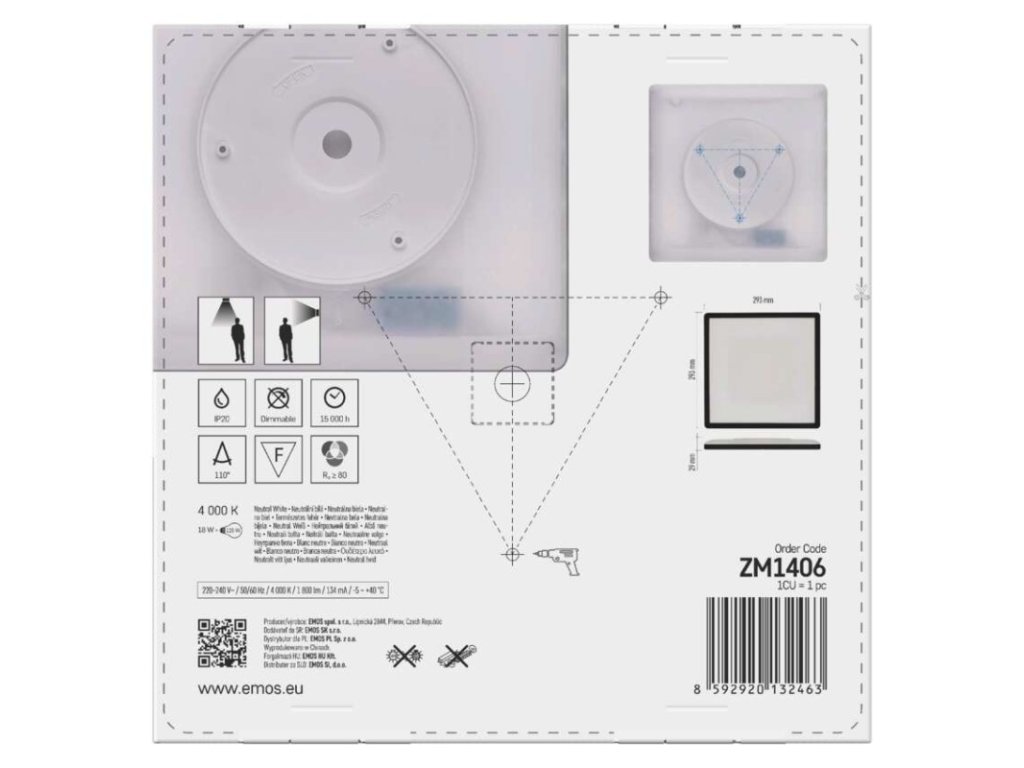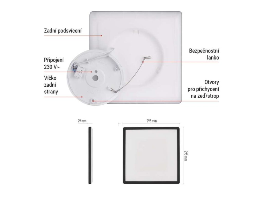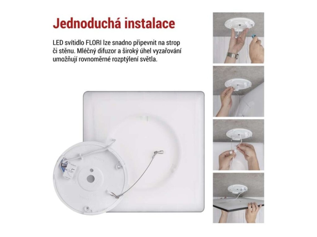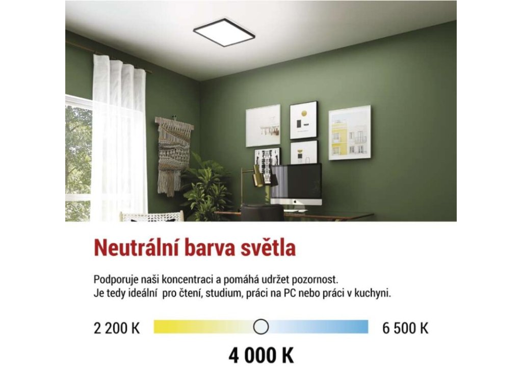 barva světla: neutrální bílá|barva těla: černá|dálkový ovladač: ne|do chodby a na schodiště: ano|do dílny a garáže: ne|do kanceláře: ne|do koupelny: ne|do kuchyně: ano|do obýváku, ložnice a dětského pokoje: ano|dosah senzoru: neuvádí se|flicker-free: neuvádí se|frekvence: 50/60 Hz|index podání barev (CRI): Ra > 80|kategorie: ESSENTIAL|krytí: IP20|materiál difuzoru: plast|materiál LGP: neuvádí se|materiál těla: plast|montážní otvor: neuvádí se|možnost stmívání: ne|náhrada za žárovku: 115 W|napětí: 220–240 V~|na zahradu a balkon: ne|pohybový senzor: ne|příkon: 18 W|prodejní obal: 1 ks, krabice|proud: 134 mA|řada: FLORI|rozměr: 293 × 293 × 29 mm|světelná účinnost: 100 lm/W|světelný tok: 1 800 lm|teplota chromatičnosti: 4 000 K|tvar: čtverec|typ difuzoru: mléčný|typ svítidla: klasické svítidlo|účiník: > 0,5|UGR<: neuvádí se|úhel vyzařování: 110°|umístění: stropní/nástěnné|výstupní proud ze zdroje: neuvádí se|záruční doba: 2 roky|zdroj světla: LED|životnost: 15 000 hodin|způsob montáže: přisazené