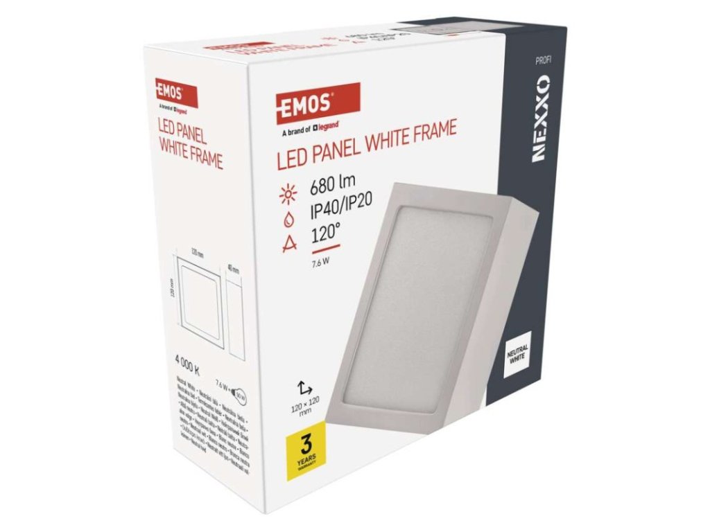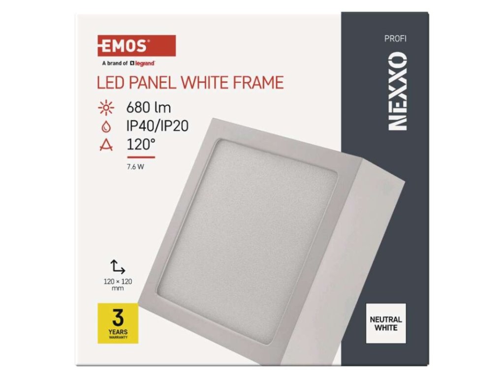 barva světla: neutrální bílá|barva těla: bílá|dálkový ovladač: ne|do chodby a na schodiště: ano|do dílny a garáže: ne|do kanceláře: ano|do koupelny: ne|do kuchyně: ano|do obýváku, ložnice a dětského pokoje: ano|dosah senzoru: nemá senzor|flicker-free: nebliká|frekvence: 50/60 Hz|index podání barev (CRI): Ra > 80|kategorie: PROFI|krytí: IP40/IP20|materiál difuzoru: plast (PMMA)|materiál LGP: PMMA|materiál těla: ocelový plech|montážní otvor: neuvádí se|možnost stmívání: ne|náhrada za žárovku: 50 W|napětí: 220–240 V|na zahradu a balkon: ne|pohybový senzor: ne|příkon: 7,6 W|prodejní obal: 1 ks, krabice|proud: 300 mA|řada: NEXXO|rozměr: 120 × 120 × 40 mm|světelná účinnost: 90 lm/W|světelný tok: 680 lm|teplota chromatičnosti: 4 000 K|tvar: čtverec|typ difuzoru: mléčný|typ svítidla: klasické svítidlo|účiník: > 0,5|UGR<: neuvádí se|úhel vyzařování: 120°|umístění: stropní/nástěnné|výstupní proud ze zdroje: neuvádí se|záruční doba: 3 roky|zdroj světla: LED|životnost: 30 000 hodin|způsob montáže: přisazené