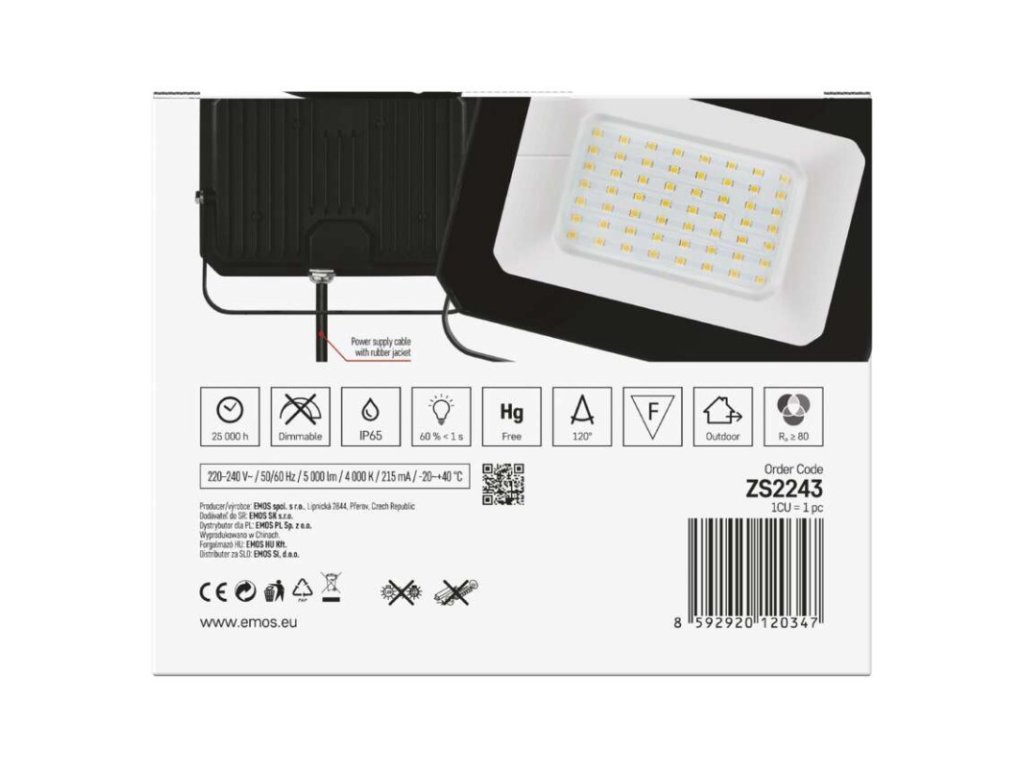 akumulátor: ne|barva: černá|barva světla: neutrální bílá|délka přívodního kabelu: 20 cm|doba svícení na AKU: neuvádí se|dosah PIR senzoru: nemá PIR|energetická třída použitého světelného zdroje: –|flicker-free: ano|frekvence: 50/60 Hz|index podání barev (CRI): Ra > 80|kategorie: ESSENTIAL|krytí: IP65|materiál difuzoru: sklo|materiál přívodního kabelu: guma|materiál těla: hliník|napájení: ze sítě|napětí: 220–240 V~|PIR senzor: ne|počet průchozích zásuvek: neuvádí se|použití: závěsná montáž|příkon: 50 W|prodejní obal: 1 ks, krabice|proud: 215 mA|řada: SIMPO|rozměr: 182 × 142 × 27 mm|rozsah pracovní teploty: -20 °C až +40 °C|stmívání: ne|stupeň ochrany proti mechanickým nárazům: neuvádí se|světelná účinnost: 100 lm/W|světelný tok: 5 000 lm|teplota chromatičnosti: 4 000 K|typ přívodního kabelu: H05RN-F|typ průchozích zásuvek: neuvádí se|účiník: > 0,9|úhel vyzařování: 120°|záruční doba: 2 roky|zdroj světla: LED|životnost: 25 000 hodin|zkušební žárovka součástí balení: ne