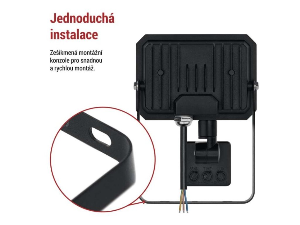 akumulátor: ne|barva: černá|barva světla: neutrální bílá|délka přívodního kabelu: 20 cm|doba svícení na AKU: neuvádí se|dosah PIR senzoru: 8 m|energetická třída použitého světelného zdroje: –|flicker-free: ano|frekvence: 50/60 Hz|index podání barev (CRI): Ra > 80|kategorie: ESSENTIAL|krytí: IP44|materiál difuzoru: sklo|materiál přívodního kabelu: guma|materiál těla: hliník|napájení: ze sítě|napětí: 220–240 V~|PIR senzor: ano|počet průchozích zásuvek: neuvádí se|použití: závěsná montáž|příkon: 20 W|prodejní obal: 1 ks, krabice|proud: 90 mA|řada: SIMPO|rozměr: 114 × 156 × 52 mm|rozsah pracovní teploty: -20 °C až +40 °C|stmívání: ne|stupeň ochrany proti mechanickým nárazům: neuvádí se|světelná účinnost: 100 lm/W|světelný tok: 2 000 lm|teplota chromatičnosti: 4 000 K|typ přívodního kabelu: H05RN-F|typ průchozích zásuvek: neuvádí se|účiník: > 0,7|úhel vyzařování: 120°|záruční doba: 2 roky|zdroj světla: LED|životnost: 25 000 hodin|zkušební žárovka součástí balení: ne