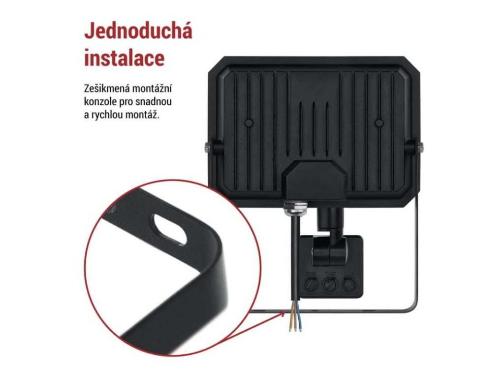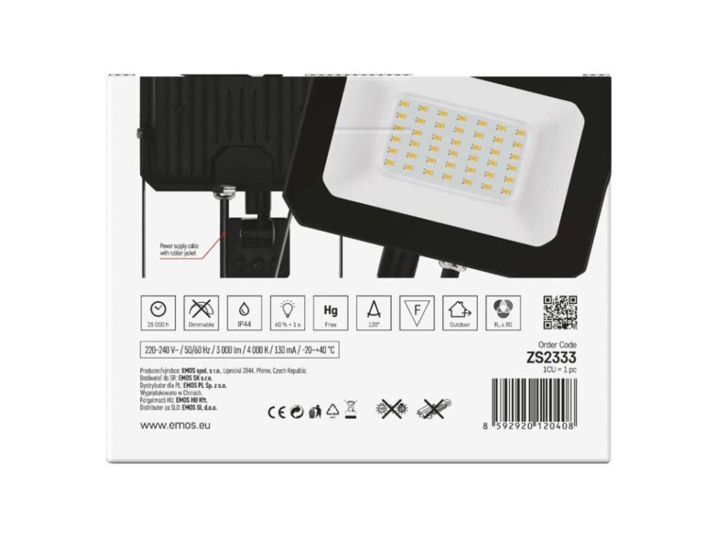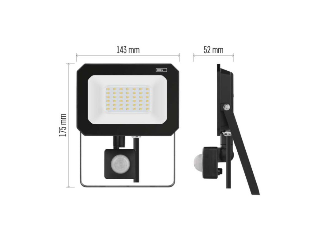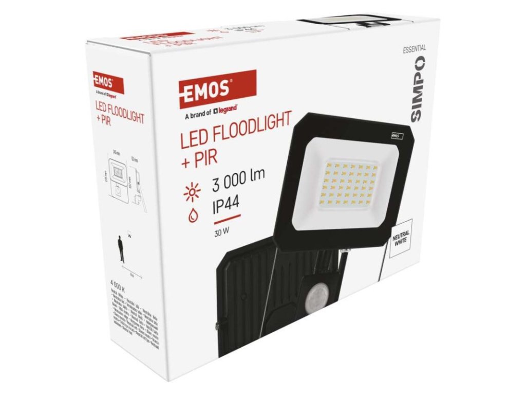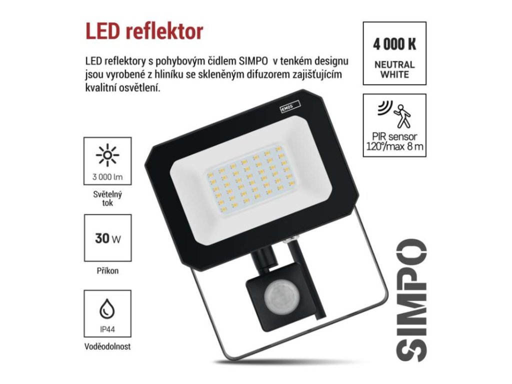 akumulátor: ne|barva: černá|barva světla: neutrální bílá|délka přívodního kabelu: 20 cm|doba svícení na AKU: neuvádí se|dosah PIR senzoru: 8 m|energetická třída použitého světelného zdroje: –|flicker-free: ano|frekvence: 50/60 Hz|index podání barev (CRI): Ra > 80|kategorie: ESSENTIAL|krytí: IP44|materiál difuzoru: sklo|materiál přívodního kabelu: guma|materiál těla: hliník|napájení: ze sítě|napětí: 220–240 V~|PIR senzor: ano|počet průchozích zásuvek: neuvádí se|použití: závěsná montáž|příkon: 30 W|prodejní obal: 1 ks, krabice|proud: 130 mA|řada: SIMPO|rozměr: 143 × 175 × 52 mm|rozsah pracovní teploty: -20 °C až +40 °C|stmívání: ne|stupeň ochrany proti mechanickým nárazům: neuvádí se|světelná účinnost: 100 lm/W|světelný tok: 3 000 lm|teplota chromatičnosti: 4 000 K|typ přívodního kabelu: H05RN-F|typ průchozích zásuvek: neuvádí se|účiník: > 0,9|úhel vyzařování: 120°|záruční doba: 2 roky|zdroj světla: LED|životnost: 25 000 hodin|zkušební žárovka součástí balení: ne