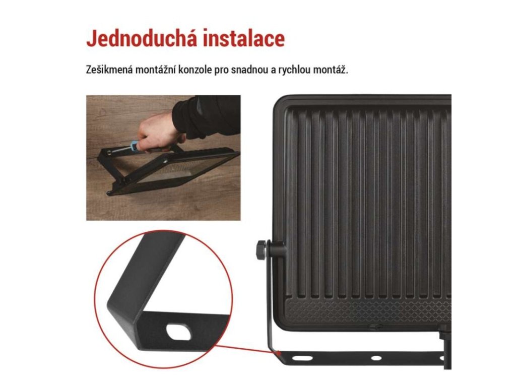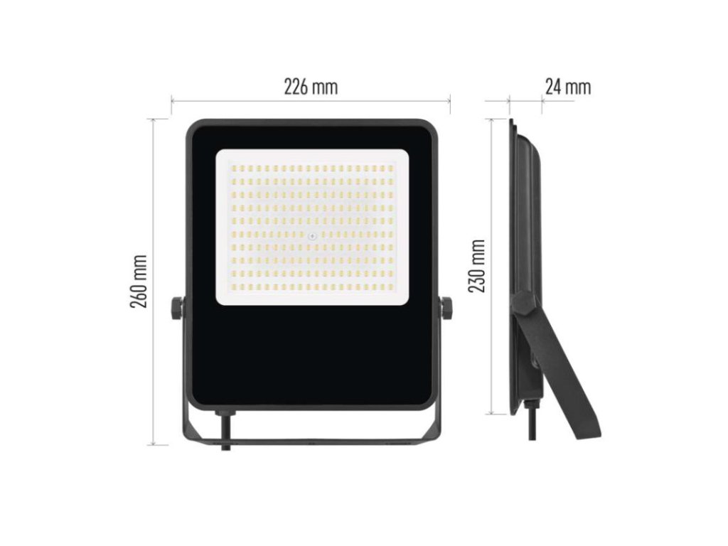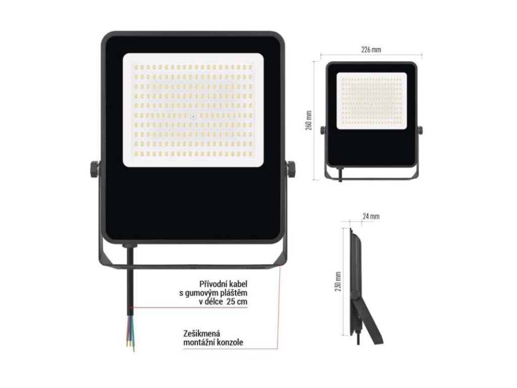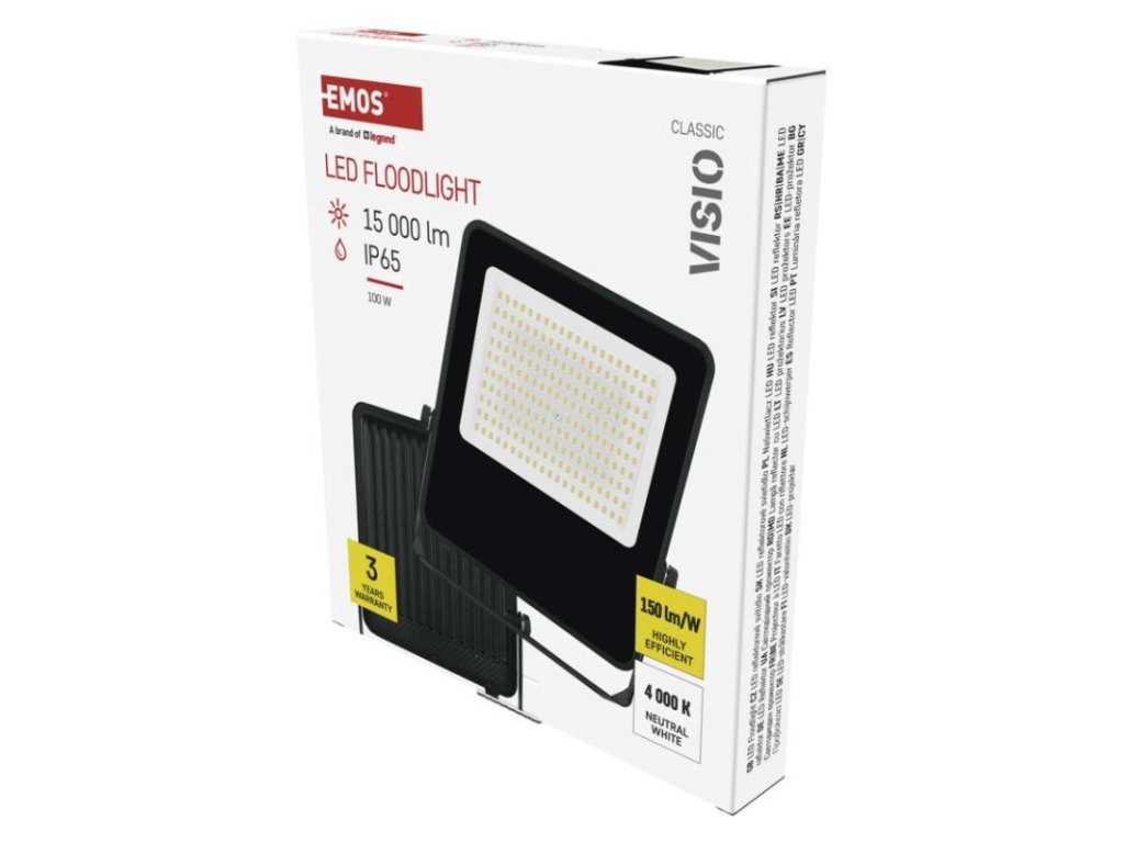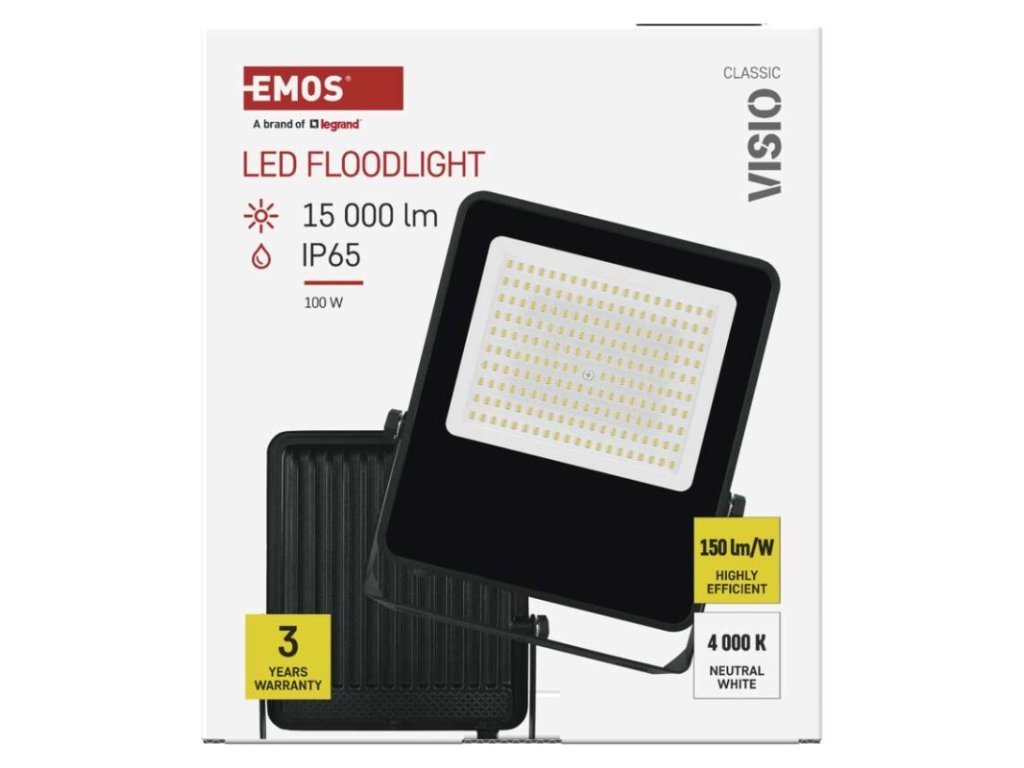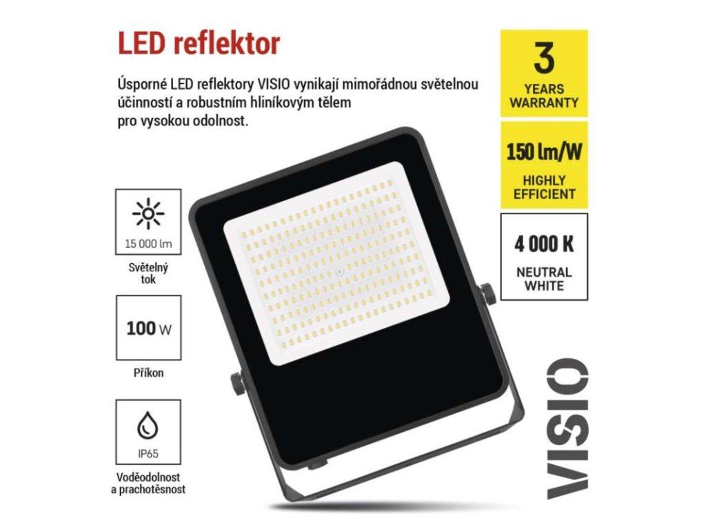 akumulátor: ne|barva: černá|barva světla: neutrální bílá|délka přívodního kabelu: 25 cm|doba svícení na AKU: –|dosah PIR senzoru: nemá PIR|energetická třída použitého světelného zdroje: –|flicker-free: ano|frekvence: 50/60 Hz|index podání barev (CRI): Ra > 80|kategorie: CLASSIC|krytí: IP65|materiál difuzoru: sklo|materiál přívodního kabelu: guma|materiál těla: hliník|napájení: ze sítě|napětí: 220–240 V~|PIR senzor: ne|počet průchozích zásuvek: –|použití: povrchová montáž|příkon: 100 W|prodejní obal: 1 ks, krabice|proud: 450 mA|řada: VISIO|rozměr: 260 × 226 × 24 mm|rozsah pracovní teploty: -20 °C až +40 °C|stmívání: ne|stupeň ochrany proti mechanickým nárazům: IK06|světelná účinnost: 150 lm/W|světelný tok: 15 000 lm|teplota chromatičnosti: 4 000 K|typ přívodního kabelu: H05RN-F|typ průchozích zásuvek: –|typ stmívání: –|účiník: > 0,9|úhel vyzařování: 110°|záruční doba: 3 roky|zdroj světla: LED|životnost: 36 000 hodin|zkušební žárovka součástí balení: ne