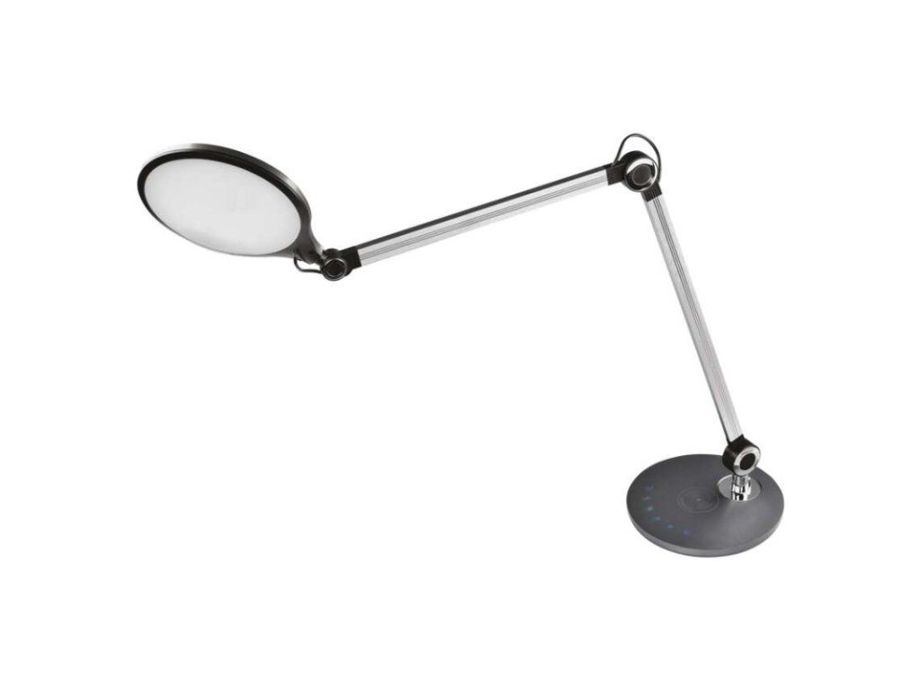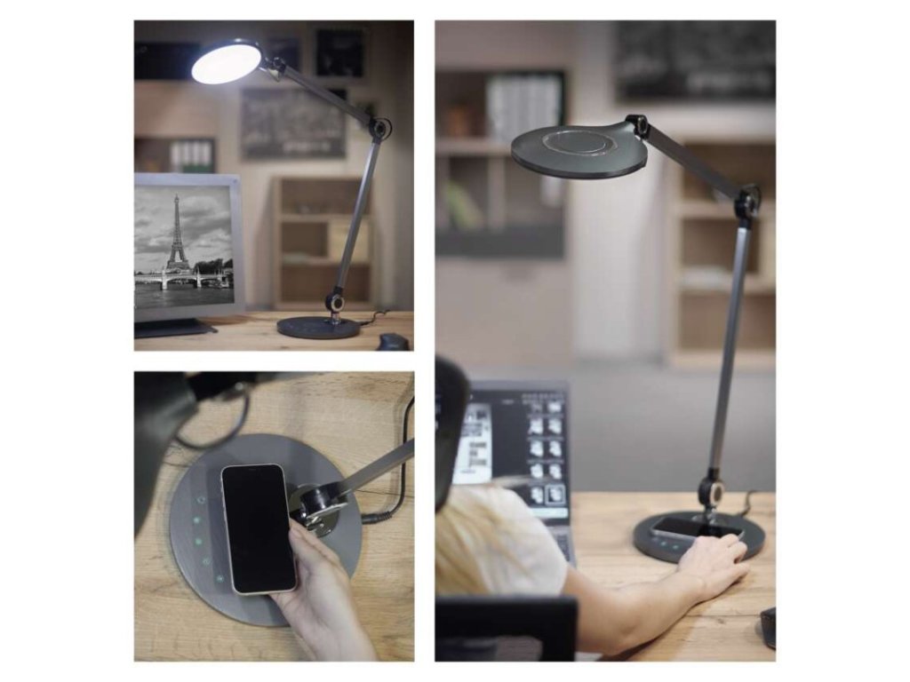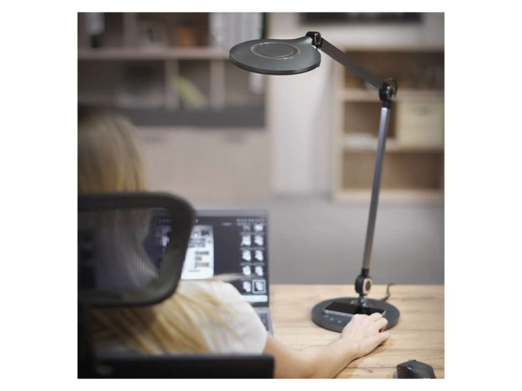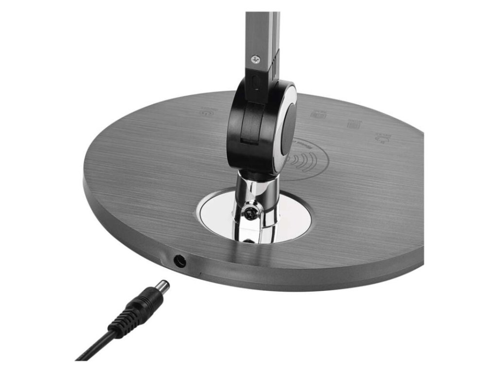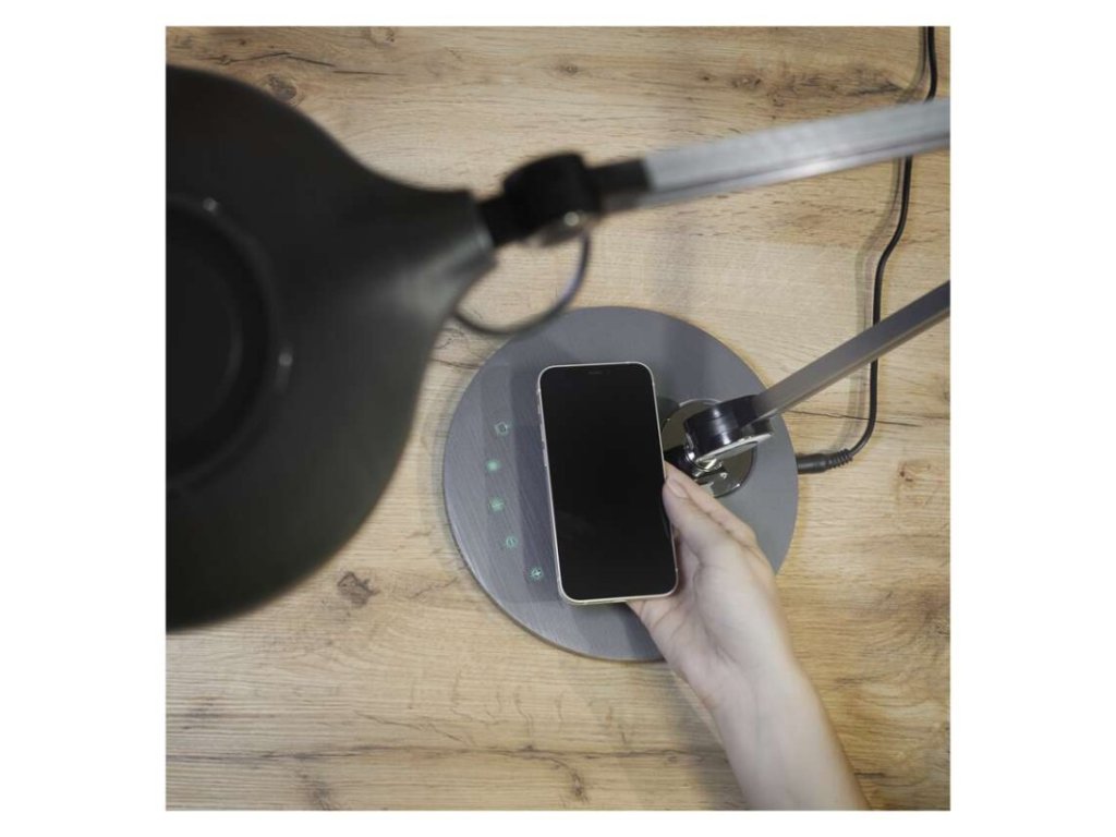 barva: tmavě šedá|barva světla: teplá/neutrální/studená bílá|činitel stárnutí: neuvádí se|čip LED: neuvádí se|délka přívodního kabelu: 1,3 m|energetická třída: E|energetická třída (od 1.9.2021): neuvádí se|index podání barev (CRI): Ra >80|integrovaná nabíjecí baterie: ne|krytí: IP20|materiál: hliník/plast|max. výkon: neuvádí se|napájecí zdroj: 13,5 V/1 500 mA|napájecí zdroj součástí balení: ano|napětí: 220–240 V|obsah rtuti: neuvádí se|patice (uchycení žárovky): neuvádí se|počet LED: neuvádí se|počet spínacích cyklů: neuvádí se|příkon: 9,2 W|prodejní obal: 1 ks, krabice|rozměr: 200 × 550 × 700 mm|rychlost náběhu na 100 %: neuvádí se|stmívání: ano|světelný tok: 640 lm|teplota chromatičnosti: 3 000/4 000/6 500 K|typ napájení: síť|účiník: neuvádí se|USB port: ne + bezdrátové nabíjení|životnost: neuvádí se