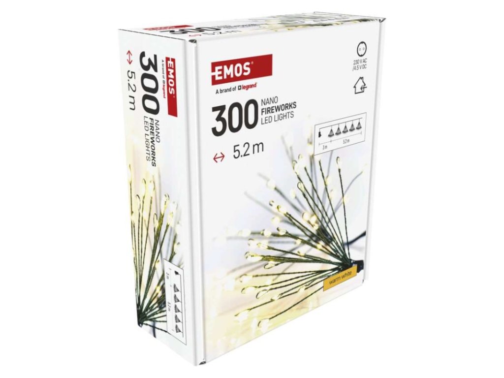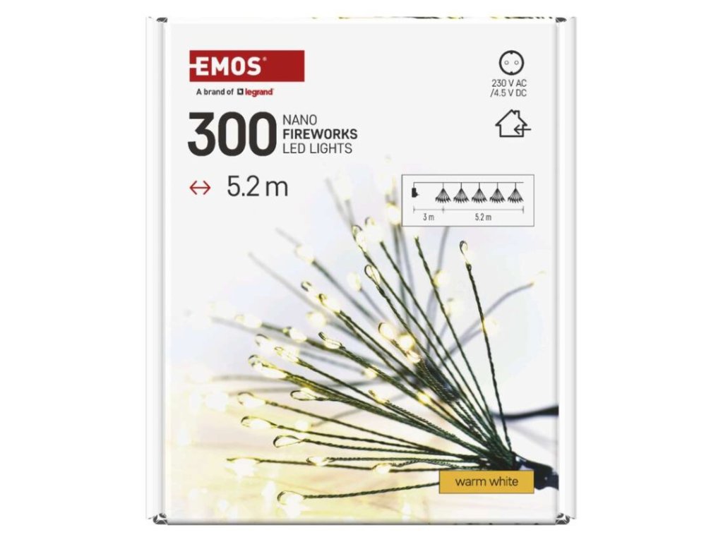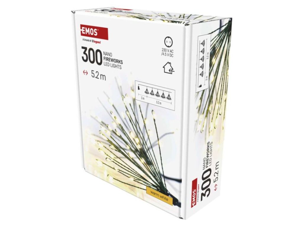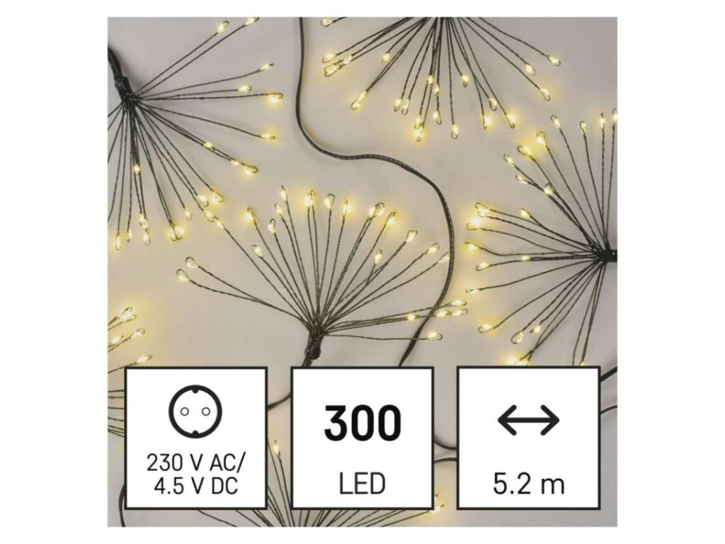 barva drátu: zelená|barva světla: teplá bílá|časovač: ano|dálkový ovladač: ne|délka přívodu: 3 m|funkce: svítí|krytí: IP20|LED mezera: neuvádí se|materiál: kov|možnost propojení: ne|počet LED: 300|použití: vnitřní|příkon: 4,5 W|prodejní obal: 1 ks, krabice|produkt: nano řetěz|pro výšku stromu: neuvádí se|rozměr: 5,2 m|tvar: nano|typ napájení: síťový adaptér|velikost LED: 3 mm (nano)|vstupní napětí: 230 V AC|výstupní napětí: 4,5 V DC|záruční doba: 2 roky|životnost: 10 000 hodin