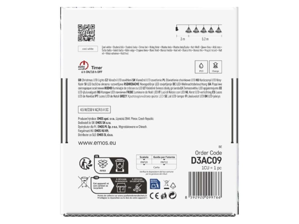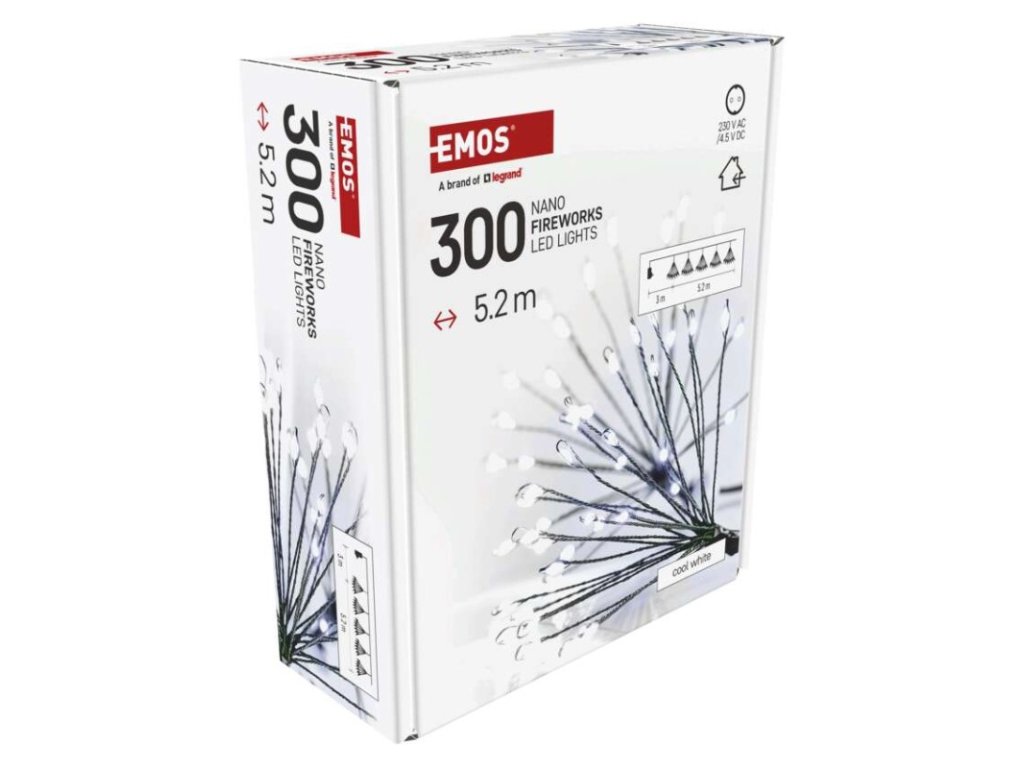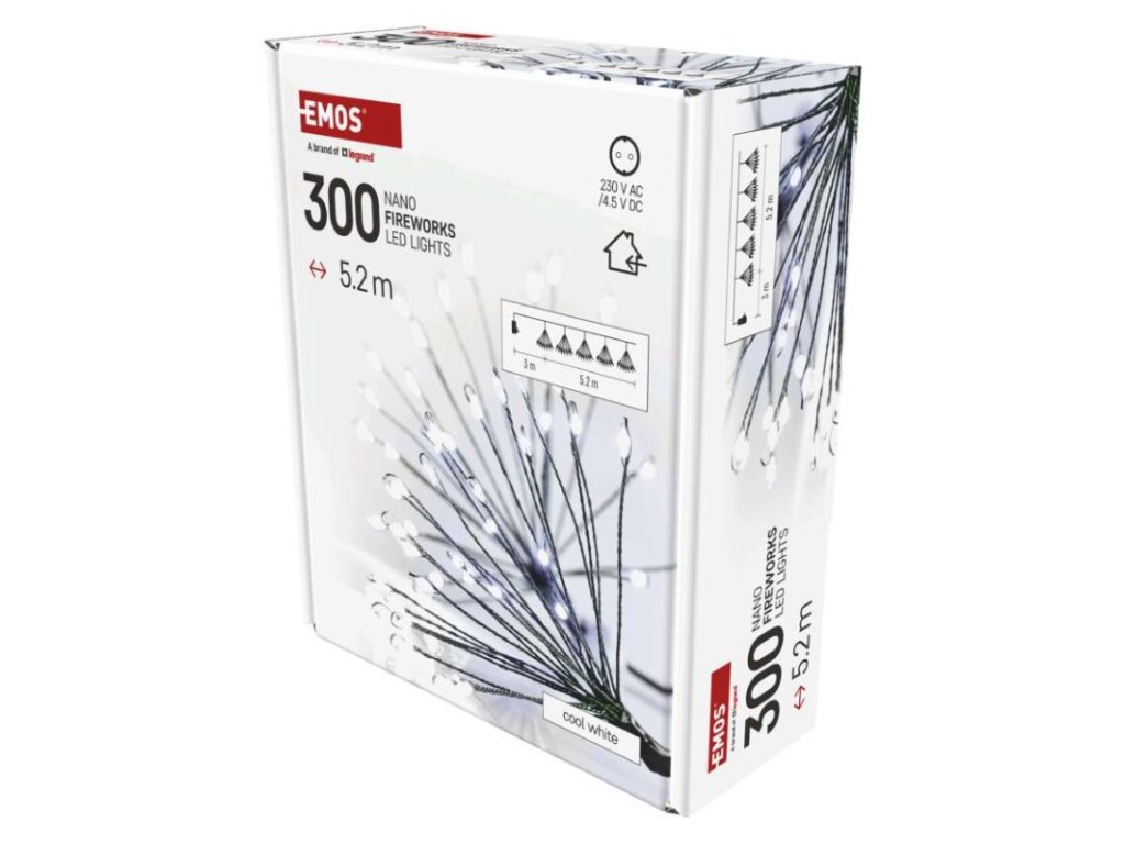 barva drátu: zelená|barva světla: studená bílá|časovač: ano|dálkový ovladač: ne|délka přívodu: 3 m|funkce: svítí|krytí: IP20|LED mezera: neuvádí se|materiál: kov|možnost propojení: ne|počet LED: 300|použití: vnitřní|příkon: 4,5 W|prodejní obal: 1 ks, krabice|produkt: nano řetěz|pro výšku stromu: neuvádí se|rozměr: 5,2 m|tvar: nano|typ napájení: síťový adaptér|velikost LED: 3 mm (nano)|vstupní napětí: 230 V AC|výstupní napětí: 4,5 V DC|záruční doba: 2 roky|životnost: 10 000 hodin