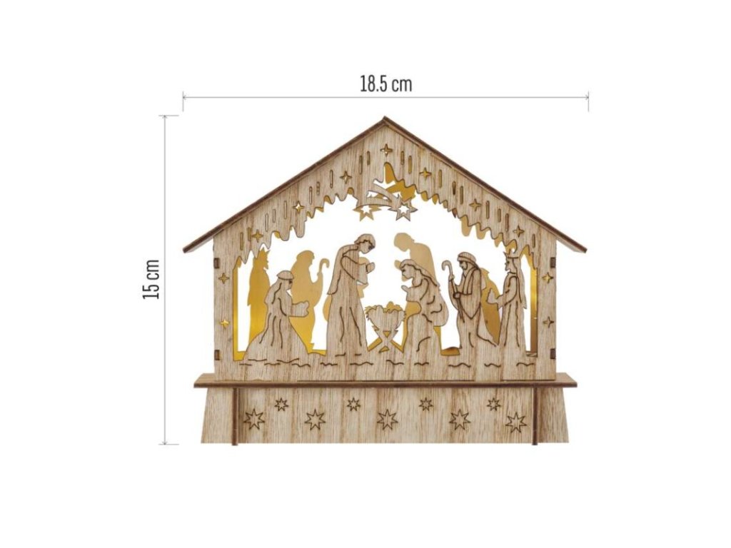 LED vánoční betlém dřevěný, 15 cm, 2x AA, vnitřní, teplá bílá, časovač