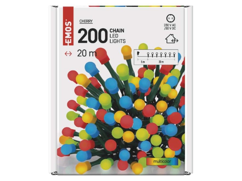 LED vánoční cherry řetěz – kuličky, 20 m, venkovní i vnitřní, multicolor, časovač