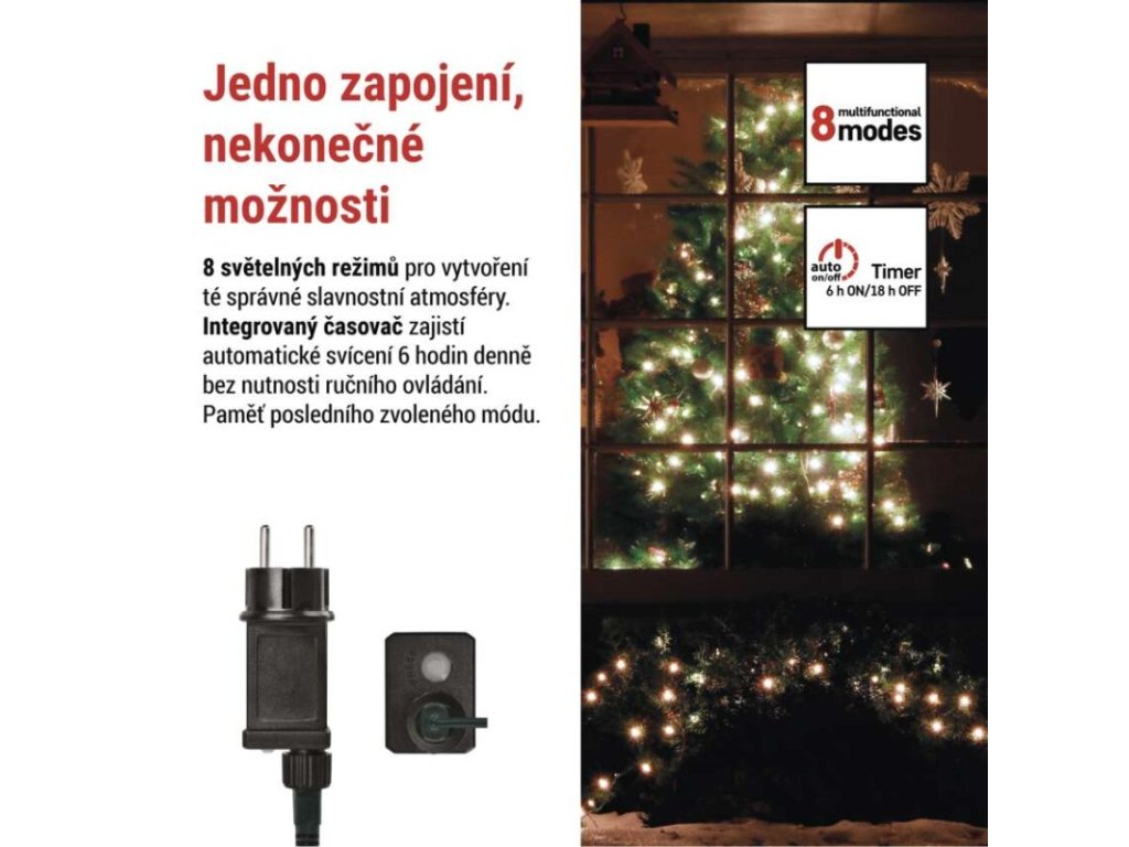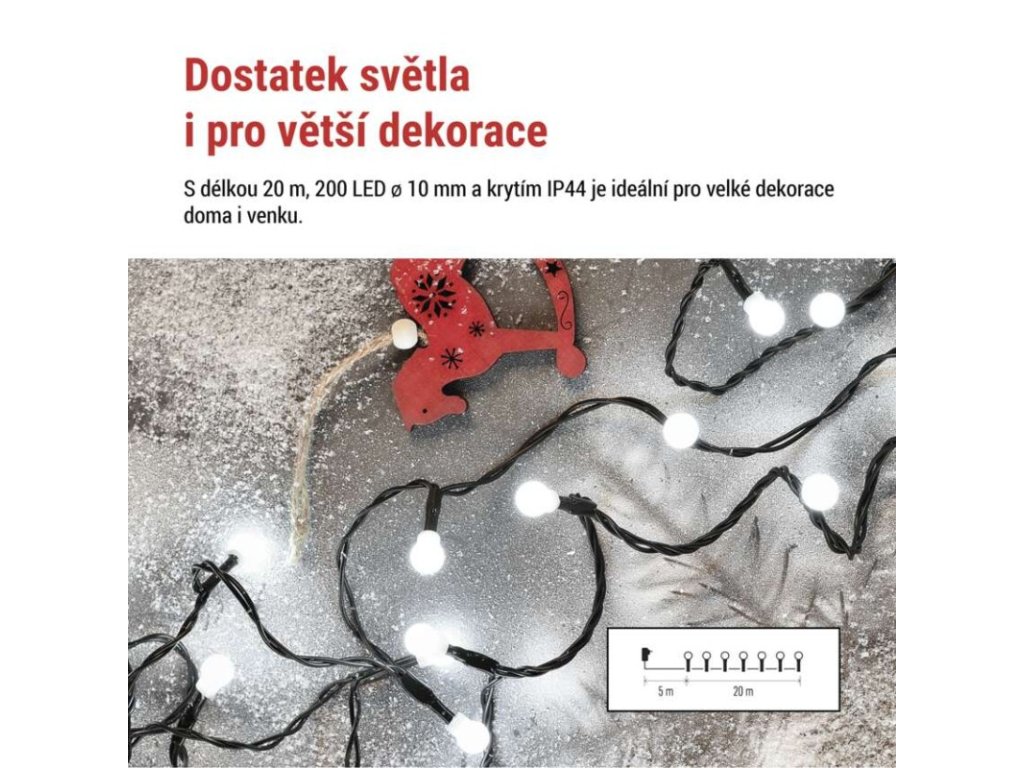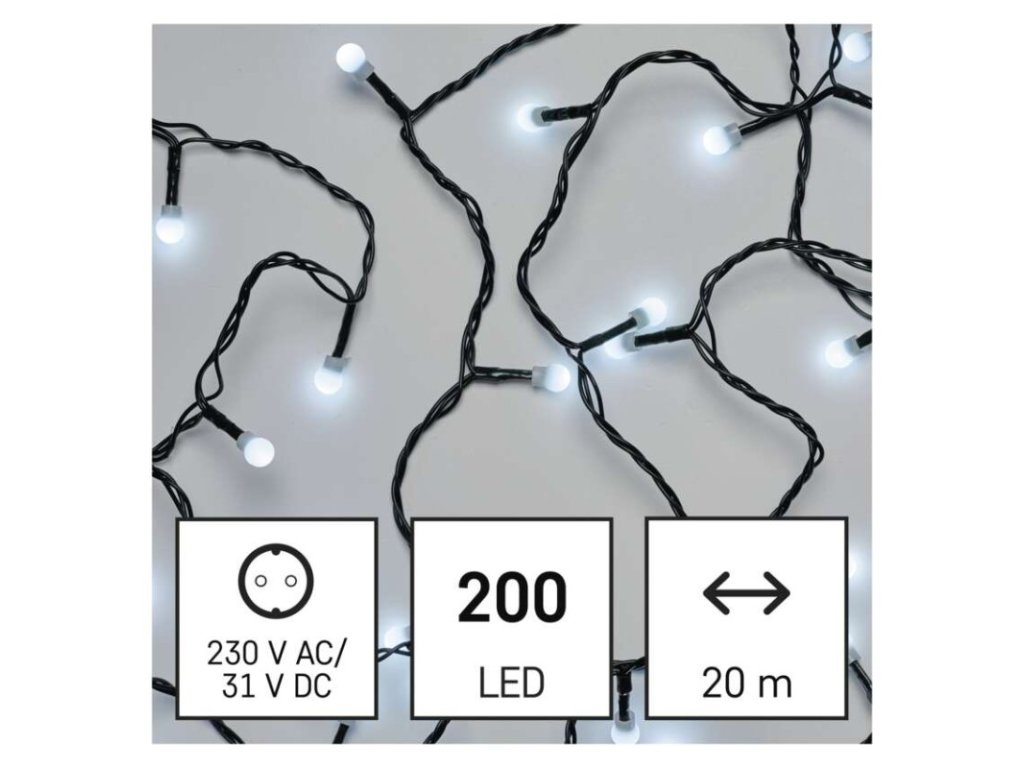 barva drátu: zelená|barva světla: studená bílá|časovač: ano|dálkový ovladač: ne|další funkce: –|délka přívodu: 5 m|funkce: 8 módů (multifunkce)|jazyky aplikace: –|kompatibilita: –|krytí: IP44|LED mezera: 10 cm|materiál: PVC|možnost propojení: ne|notifikace do mobilní aplikace: ne|ovládání hlasovými asistenty: ne|počet LED: 200|podporované OS: –|použití: venkovní i vnitřní|přenosová frekvence: –|příkon: 3,6 W|prodejní obal: 1 ks, krabice|produkt: řetěz|protokol: –|pro výšku stromu: 210 cm|rozměr: 20 m|tvar: kulička|typ napájení: síťový adaptér|velikost LED: 10 mm|vstupní napětí: 230 V AC|výstupní napětí: 31 V DC|záruční doba: 2 roky|životnost: 10 000 hodin