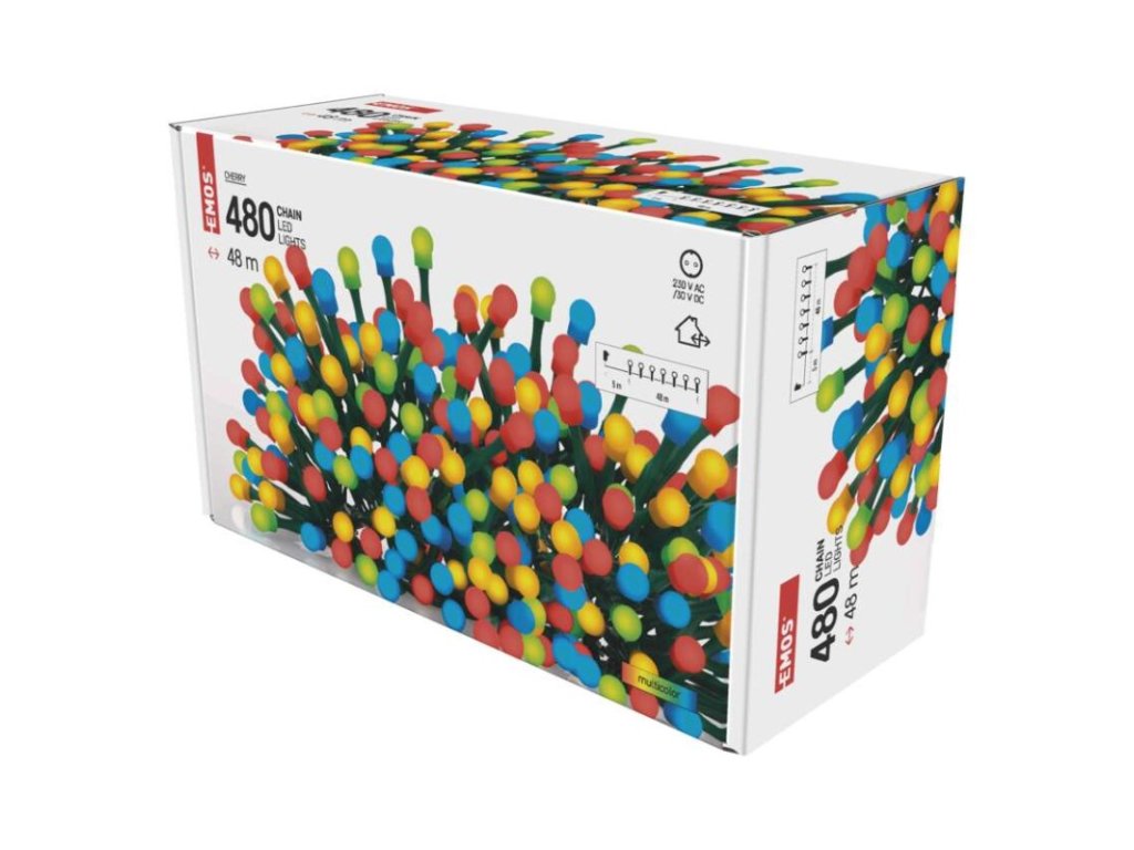 LED vánoční cherry řetěz – kuličky, 48 m, venkovní i vnitřní, multicolor, časovač
