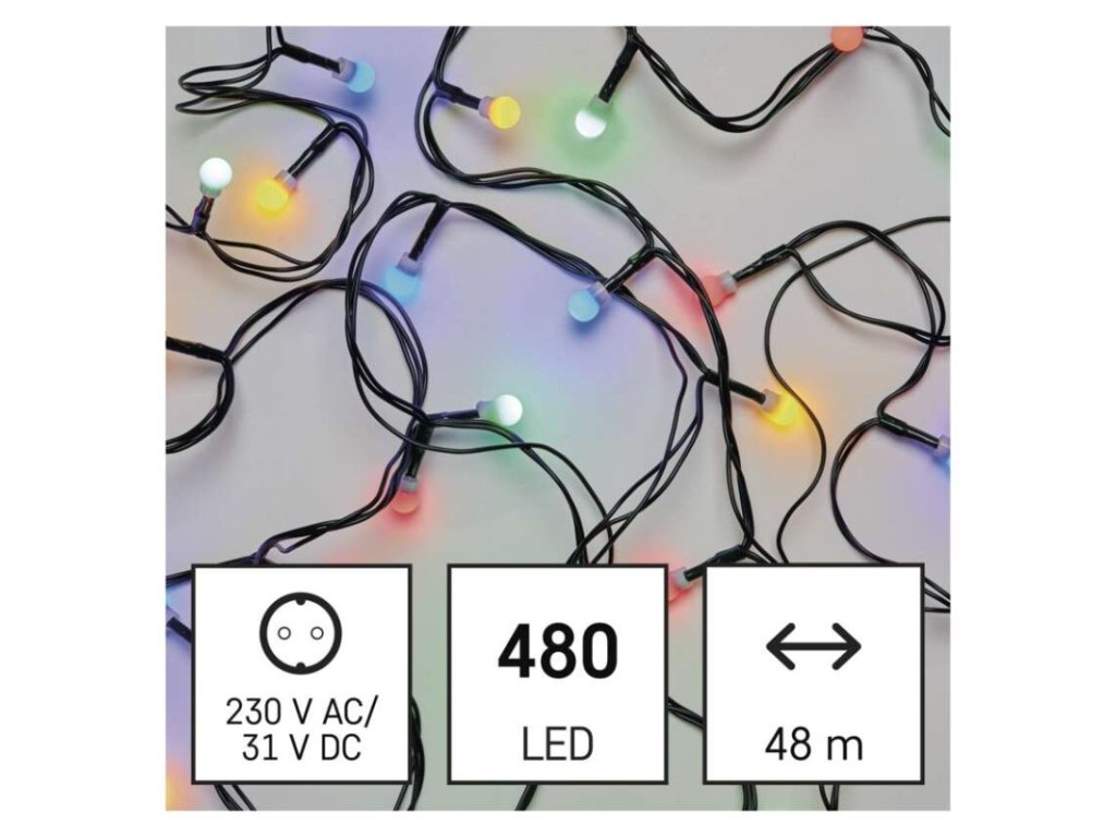 barva drátu: zelená|barva světla: multicolor|časovač: ano|dálkový ovladač: ne|délka přívodu: 5 m|funkce: svítí|krytí: IP44|LED mezera: 10 cm|materiál: PVC|možnost propojení: ne|počet LED: 480|použití: venkovní i vnitřní|příkon: 9 W|prodejní obal: 1 ks, krabice|produkt: řetěz|pro výšku stromu: 300 cm|rozměr: 48 m|tvar: kulička|typ napájení: síťový adaptér|velikost LED: 10 mm|vstupní napětí: 230 V AC|výstupní napětí: 31 V DC|záruční doba: 2 roky|životnost: 10 000 hodin