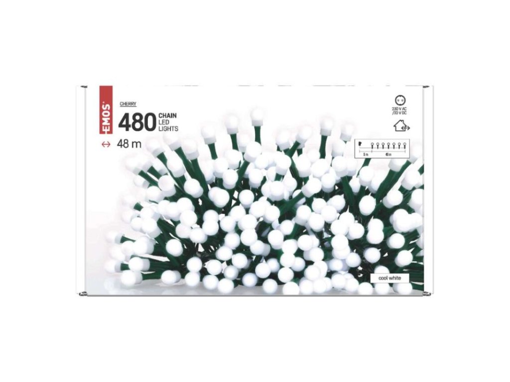 LED vánoční cherry řetěz – kuličky, 48 m, venkovní i vnitřní, studená bílá, časovač