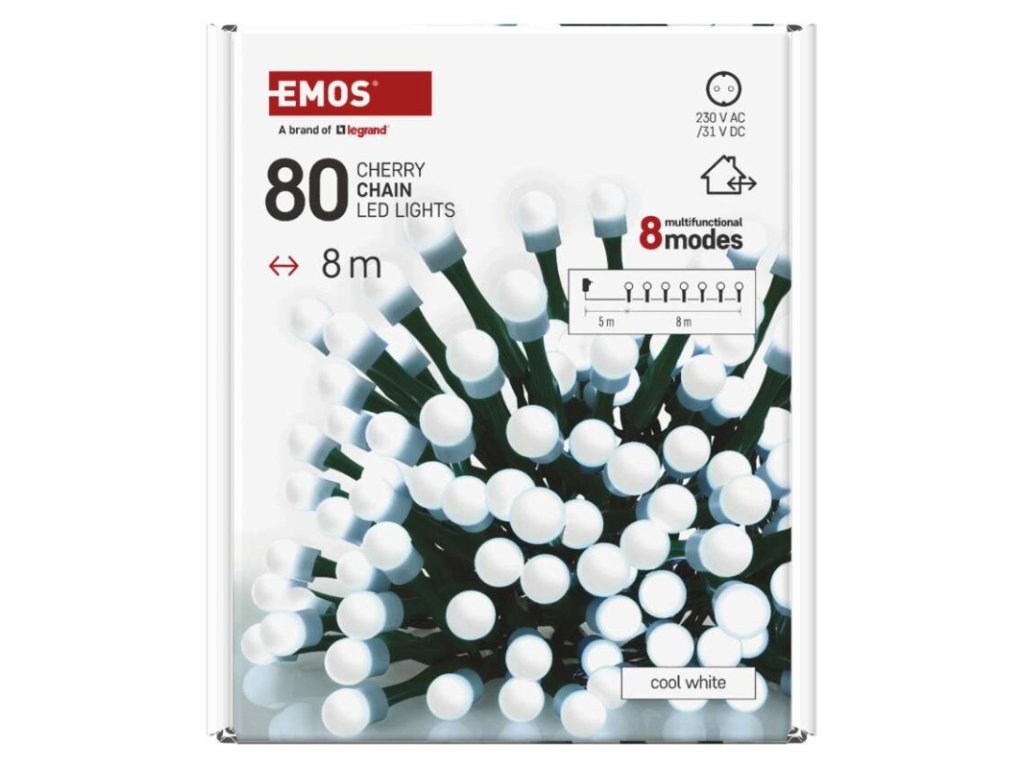 barva drátu: zelená|barva světla: studená bílá|časovač: ano|dálkový ovladač: ne|další funkce: –|délka přívodu: 5 m|funkce: 8 módů (multifunkce)|jazyky aplikace: –|kompatibilita: –|krytí: IP44|LED mezera: 10 cm|materiál: PVC|možnost propojení: ne|notifikace do mobilní aplikace: ne|ovládání hlasovými asistenty: ne|počet LED: 80|podporované OS: –|použití: venkovní i vnitřní|přenosová frekvence: –|příkon: 3,6 W|prodejní obal: 1 ks, krabice|produkt: řetěz|protokol: –|pro výšku stromu: 140 cm|rozměr: 8 m|tvar: kulička|typ napájení: síťový adaptér|velikost LED: 10 mm|vstupní napětí: 230 V AC|výstupní napětí: 31 V DC|záruční doba: 2 roky|životnost: 10 000 hodin