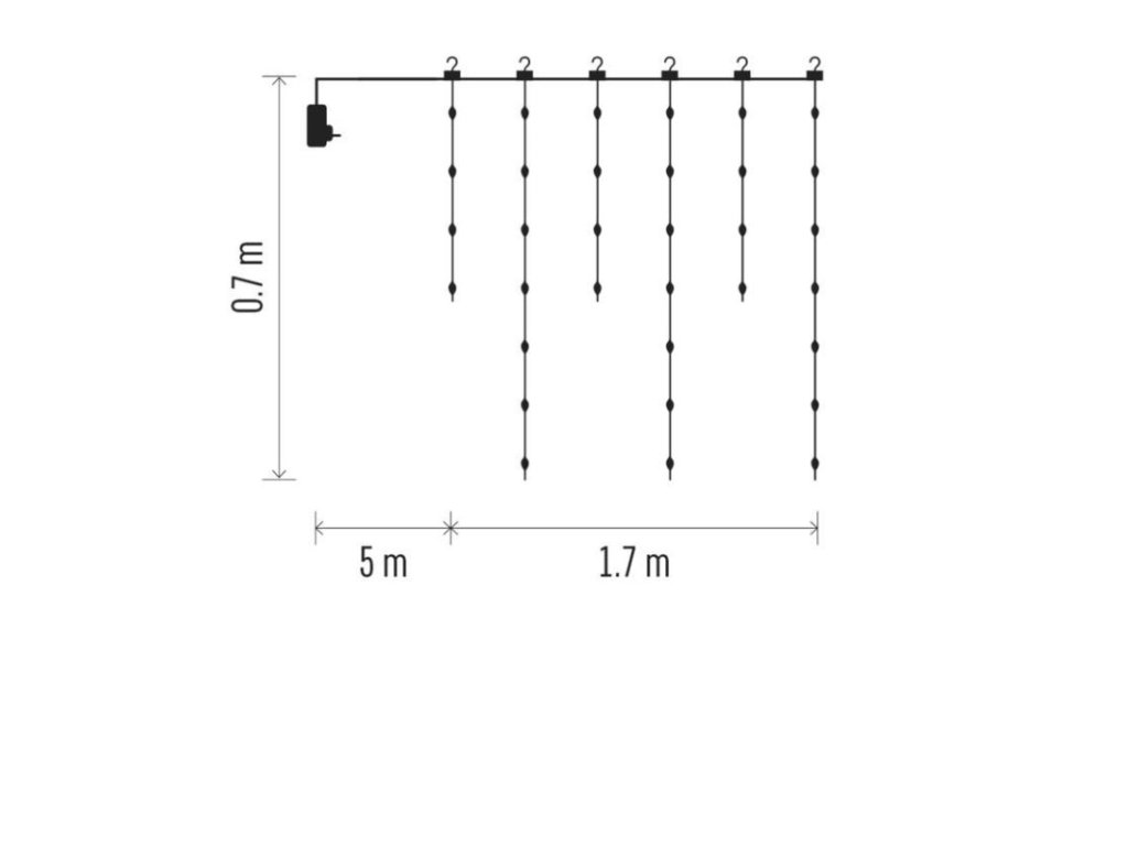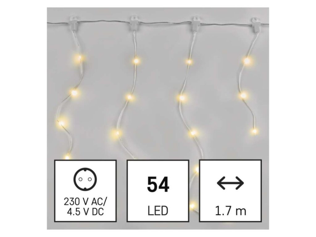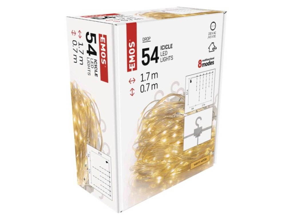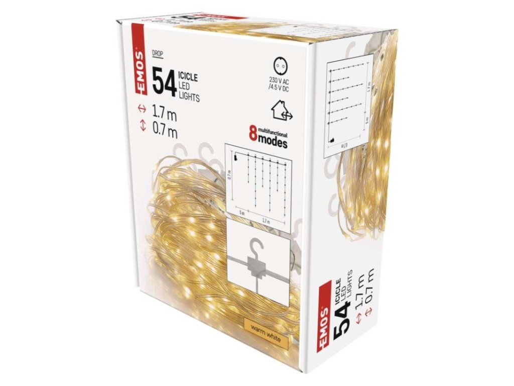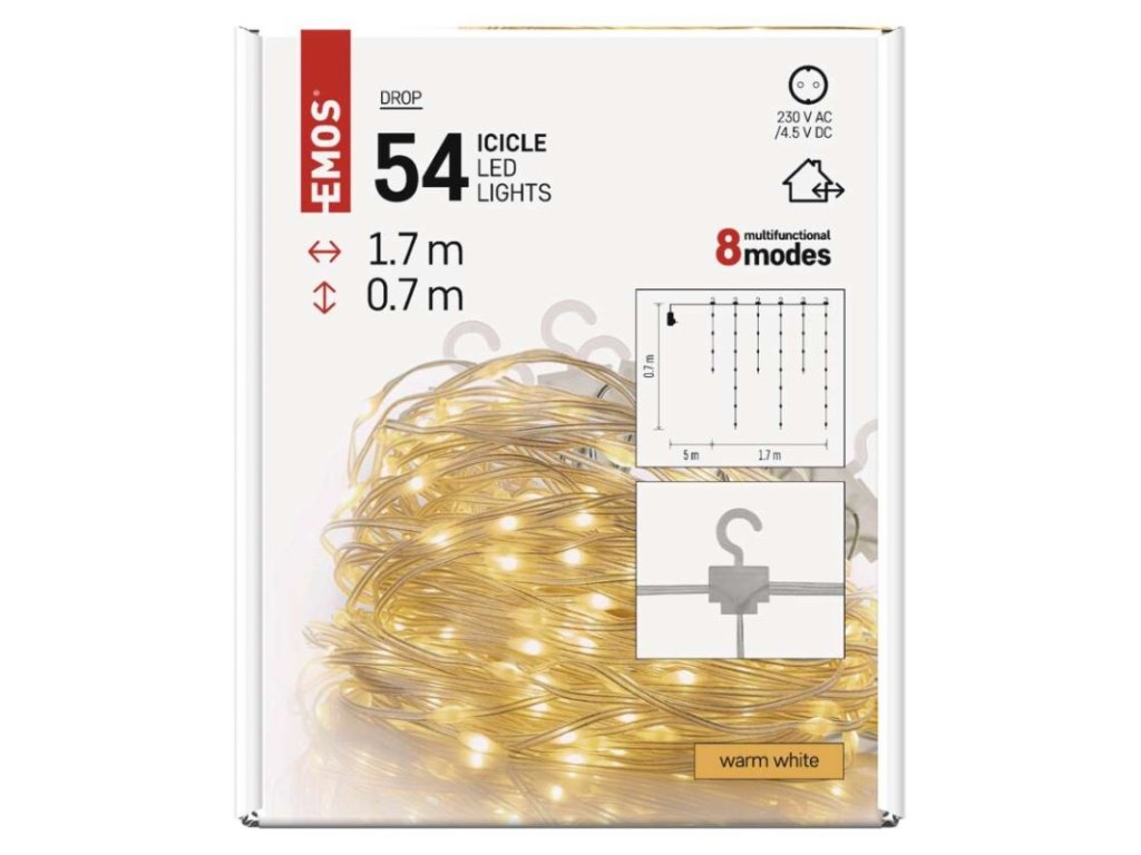 barva drátu: transparentní|barva světla: teplá bílá|časovač: ano|dálkový ovladač: ne|další funkce: –|délka přívodu: 5 m|funkce: 8 módů (multifunkce)|jazyky aplikace: –|kompatibilita: –|krytí: IP44|LED mezera: neuvádí se|materiál: PVC|možnost propojení: ne|notifikace do mobilní aplikace: ne|počet LED: 54|podporované OS: –|použití: venkovní i vnitřní|přenosová frekvence: –|příkon: 2,1 W|prodejní obal: 1 ks, krabice|produkt: krápníky|protokol: –|pro výšku stromu: neuvádí se|rozměr: 1,7 × 0,7 m|tvar: drop|typ napájení: síťový adaptér|velikost LED: neuvádí se|vstupní napětí: 230 V AC|výstupní napětí: 4,5 V DC|záruční doba: 2 roky|životnost: 10 000 hodin