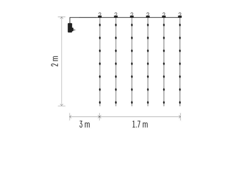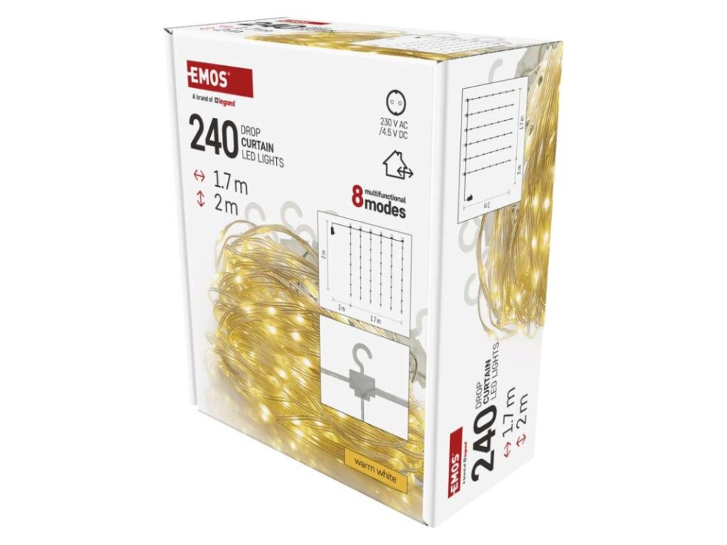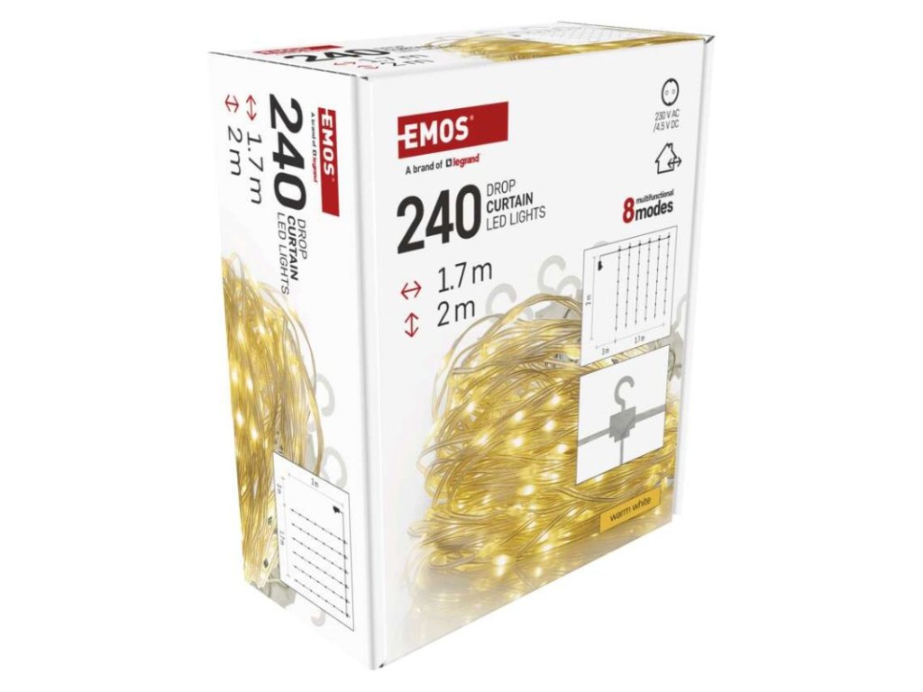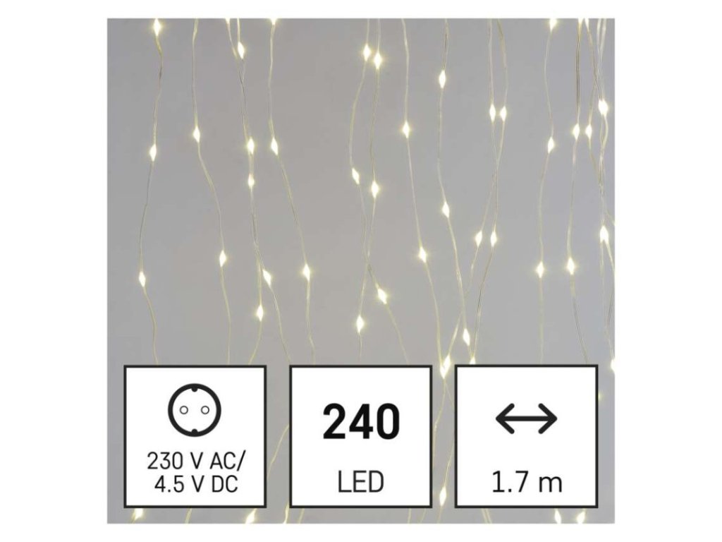 barva drátu: transparentní|barva světla: teplá bílá|časovač: ano|dálkový ovladač: ne|další funkce: –|délka přívodu: 3 m|funkce: 8 módů (multifunkce)|jazyky aplikace: –|kompatibilita: –|krytí: IP44|LED mezera: neuvádí se|materiál: neuvádí se|možnost propojení: ne|počet LED: 240|podporované OS: –|použití: venkovní i vnitřní|přenosová frekvence: –|příkon: 2,7 W|prodejní obal: 1 ks, krabice|produkt: záclona|protokol: –|pro výšku stromu: neuvádí se|rozměr: 1,7 × 2 m|tvar: drop|typ napájení: síťový adaptér|velikost LED: neuvádí se|vstupní napětí: 230 V AC|výstupní napětí: 4,5 V DC|záruční doba: 2 roky|životnost: 10 000 hodin