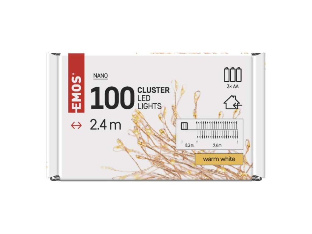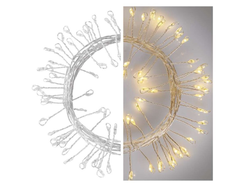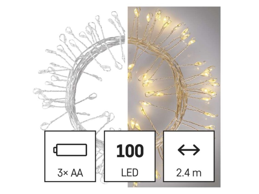 barva drátu: stříbrná|barva světla: teplá bílá|časovač: ano|dálkový ovladač: ne|délka přívodu: 0,3 m|funkce: svítí|krytí: IP20|LED mezera: 2,4 cm|materiál: kov|možnost propojení: ne|počet LED: 100|použití: vnitřní|příkon: 0,9 W|prodejní obal: 1 ks, krabice|produkt: ježek|pro výšku stromu: neuvádí se|rozměr: 2,4 m|tvar: nano|typ napájení: baterie 3× AA (není součástí balení)|velikost LED: 3 mm (nano)|vstupní napětí: neuvádí se|výstupní napětí: 4,5 V DC|záruční doba: 2 roky|životnost: 10 000 hodin